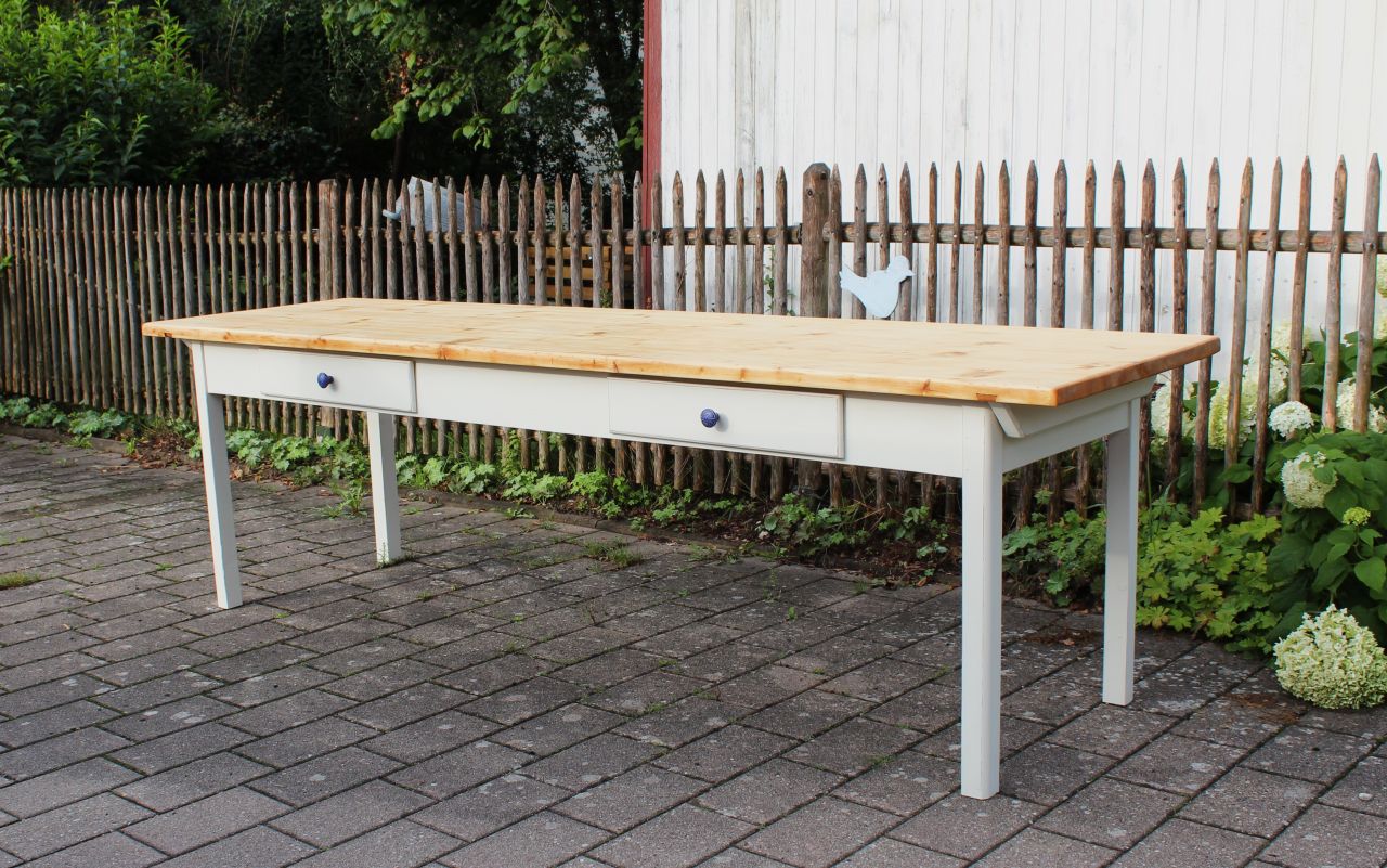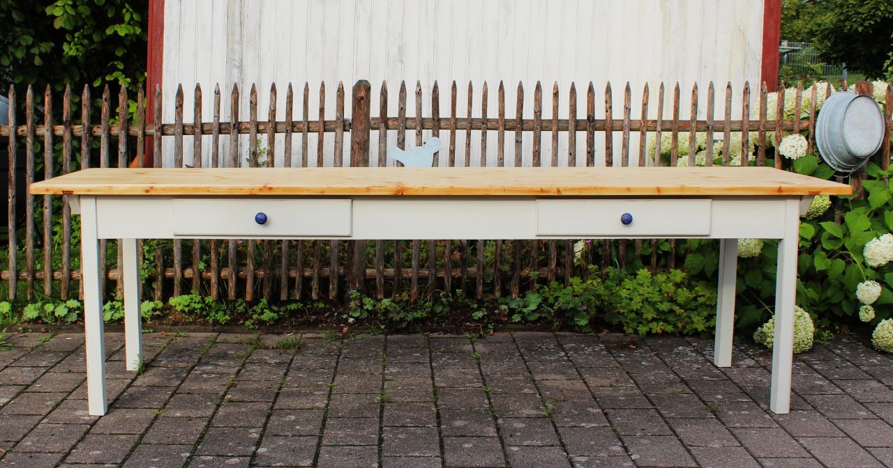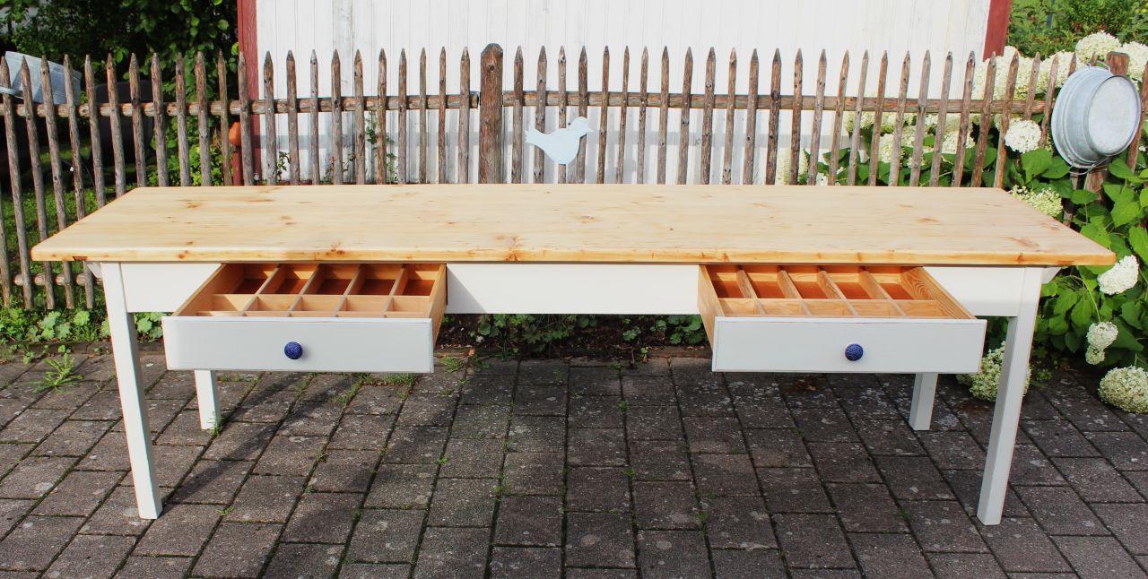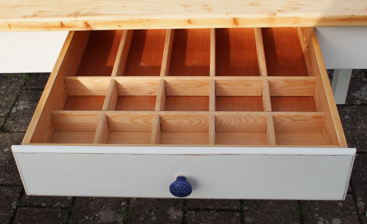 Schöner, stabiler Vollholztisch mit 2 Schubladen. War vermutlich eine Schreinerarbeit, keine Serienproduktion. Da er etwas höher als ein Esstisch ist (normalerweise 76 – 78 cm Höhe, hier 84 cm) war er vermutlich ein Arbeitstisch. Wen das nicht stört, dann ist er auch ein wunderbarer Esstisch für eine große Familie. Wer die Aufteilung in der Schublade nicht benötigt, man kann sie einfach herausnehmen. Das Gestell haben wir mit ökologischer Kreidefarbe gestaltet (Amazona Off-White). Vor der Versiegelung mit Bienenwachs haben wir die Kanten angeschliffen. Die ca. 3,5 cm starke Weichholzplatte haben wir frisch geschliffen und abschließend mit lebensmittelechtem, Osmo-Hartwachs-Öl eingelassen. Die Knöpfe sind neu.