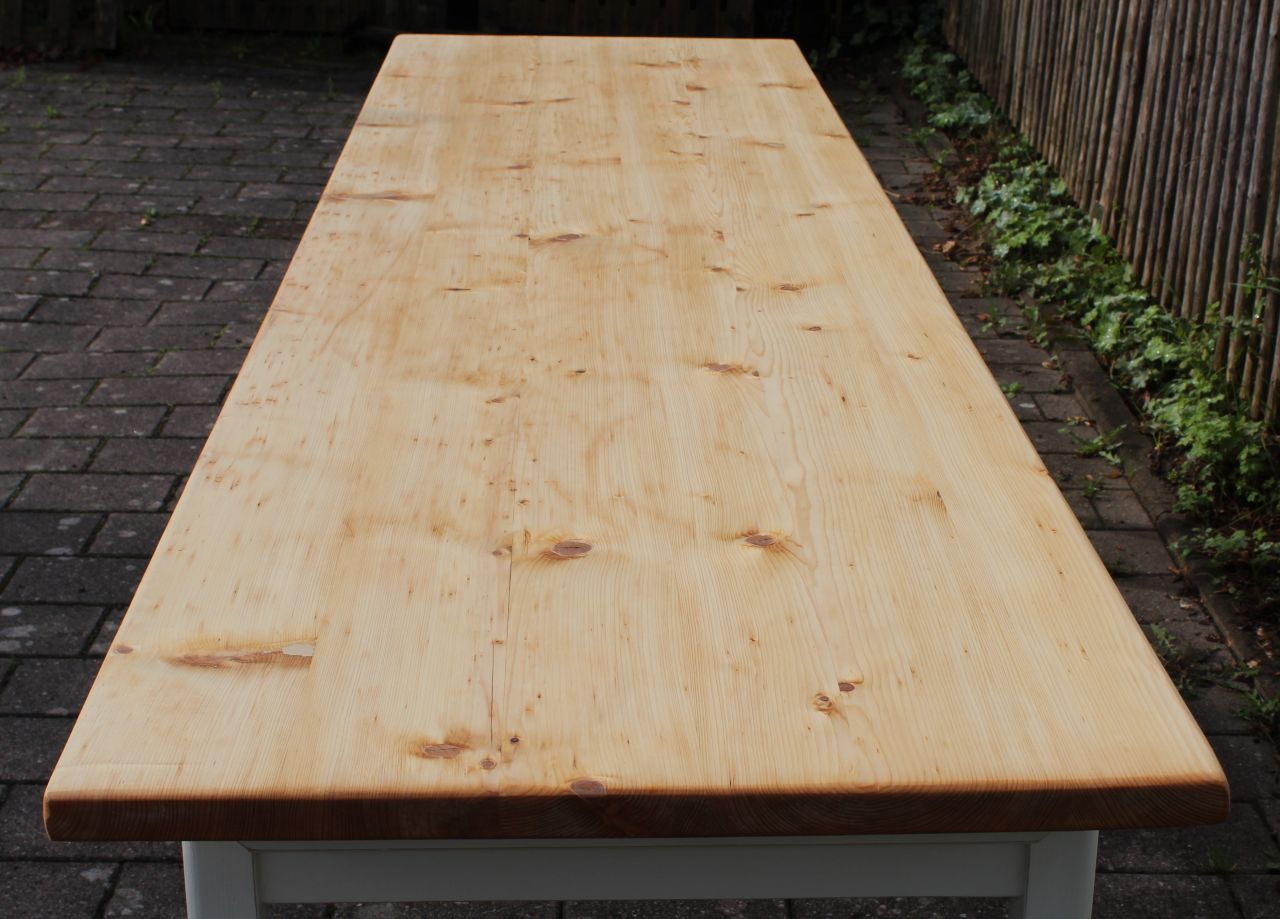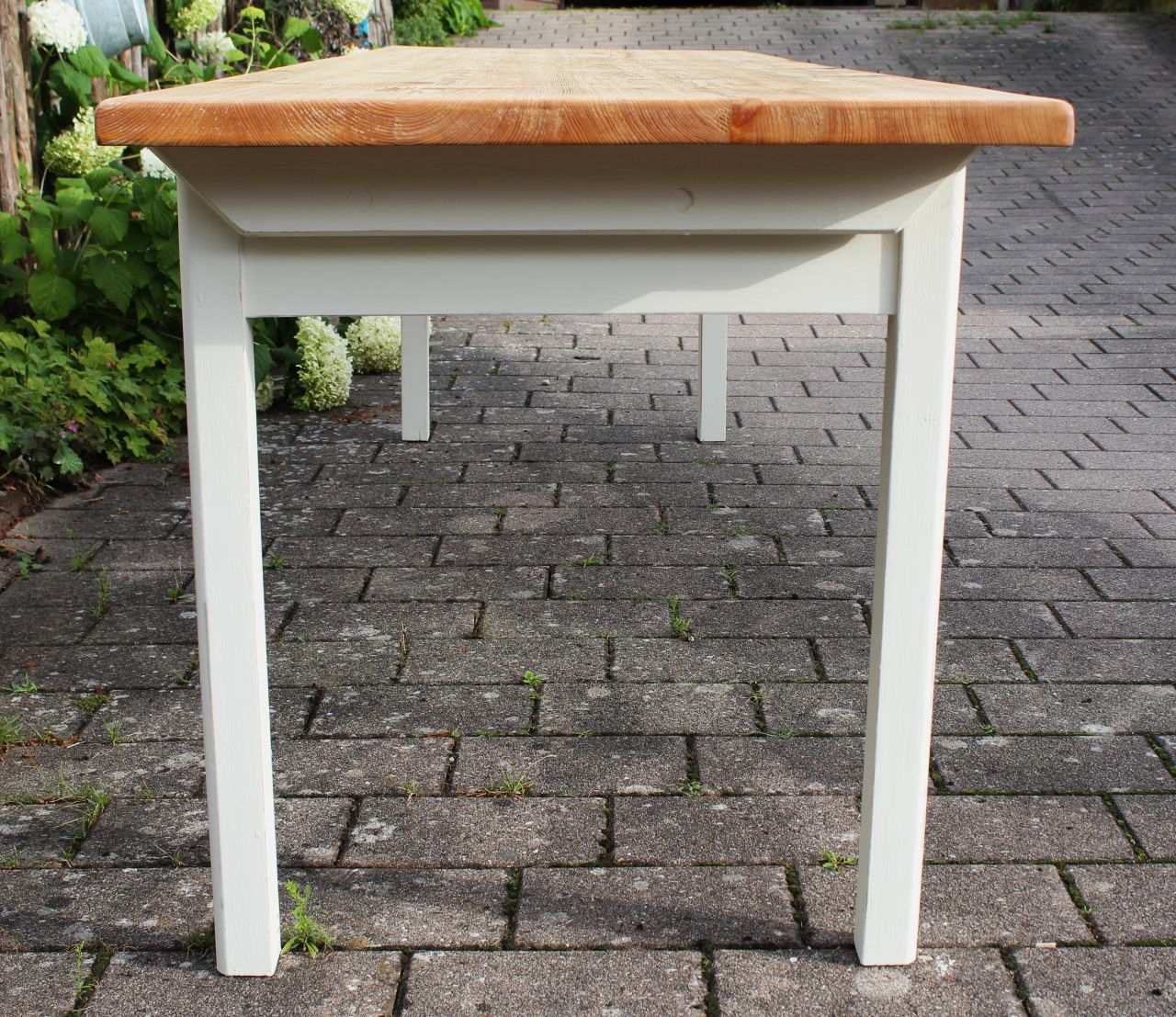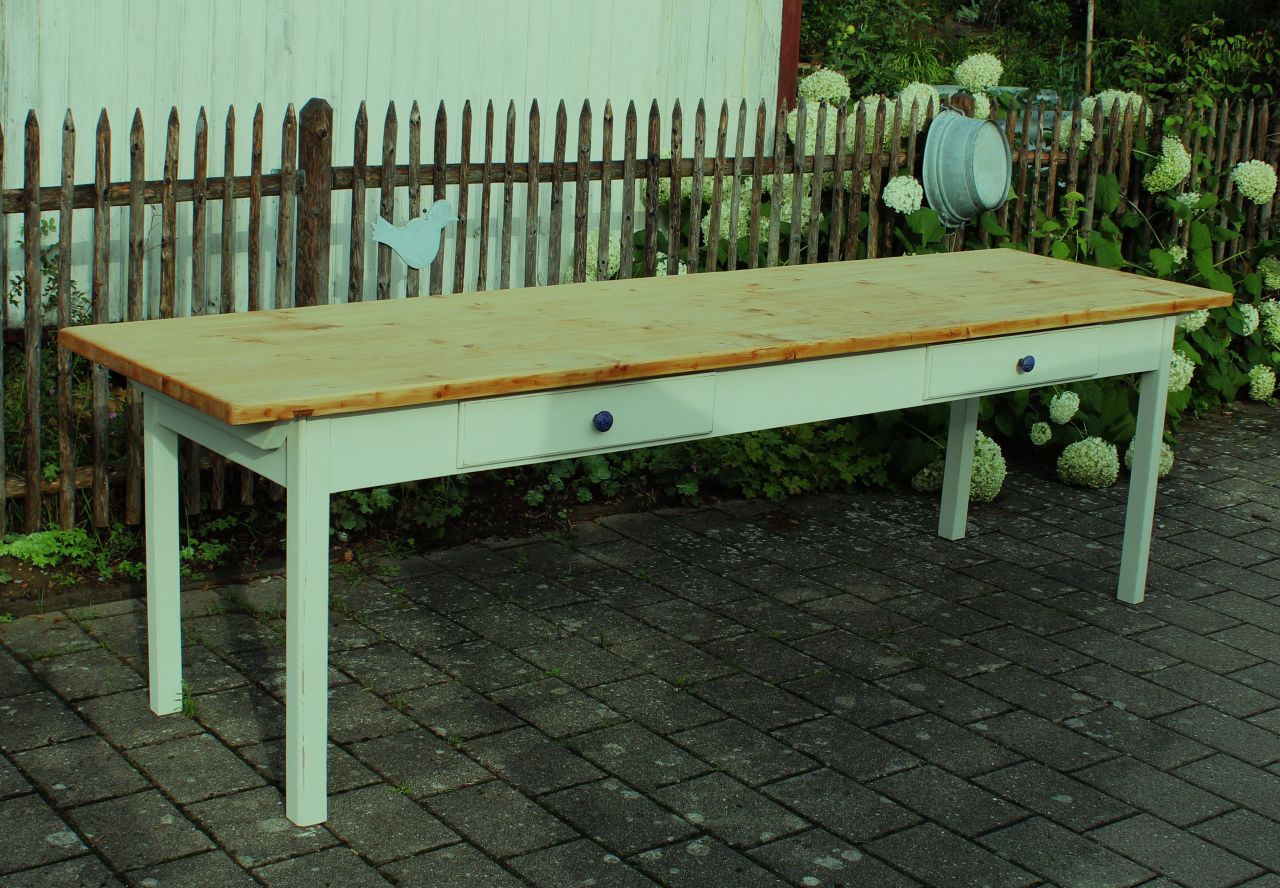 Schöner, stabiler Vollholztisch mit 2 Schubladen. War vermutlich eine Schreinerarbeit, keine Serienproduktion. Da er etwas höher als ein Esstisch ist (normalerweise 76 – 78 cm Höhe, hier 84 cm) war er vermutlich ein Arbeitstisch. Wen das nicht stört, dann ist er auch ein wunderbarer Esstisch für eine große Familie. Wer die Aufteilung in der Schublade nicht benötigt, man kann sie einfach herausnehmen. Das Gestell haben wir mit ökologischer Kreidefarbe gestaltet (Amazona Off-White). Vor der Versiegelung mit Bienenwachs haben wir die Kanten angeschliffen. Die ca. 3,5 cm starke Weichholzplatte haben wir frisch geschliffen und abschließend mit lebensmittelechtem, Osmo-Hartwachs-Öl eingelassen. Die Knöpfe sind neu.