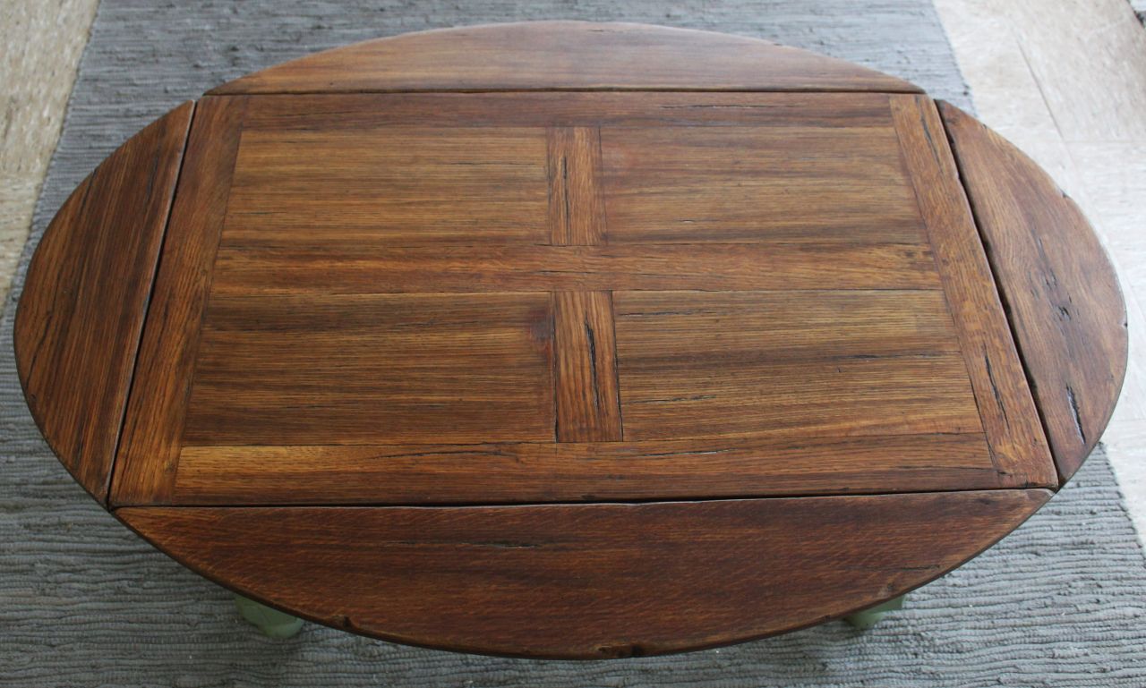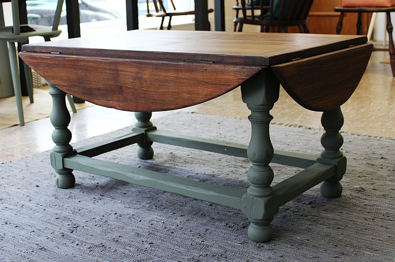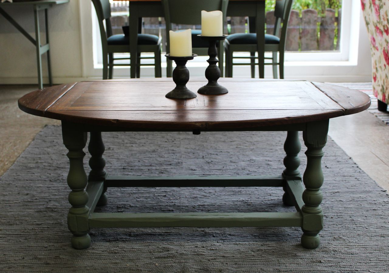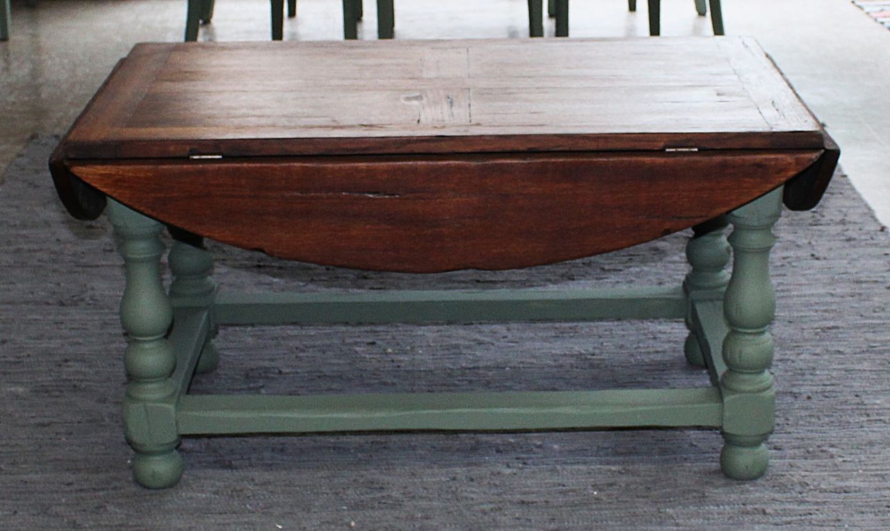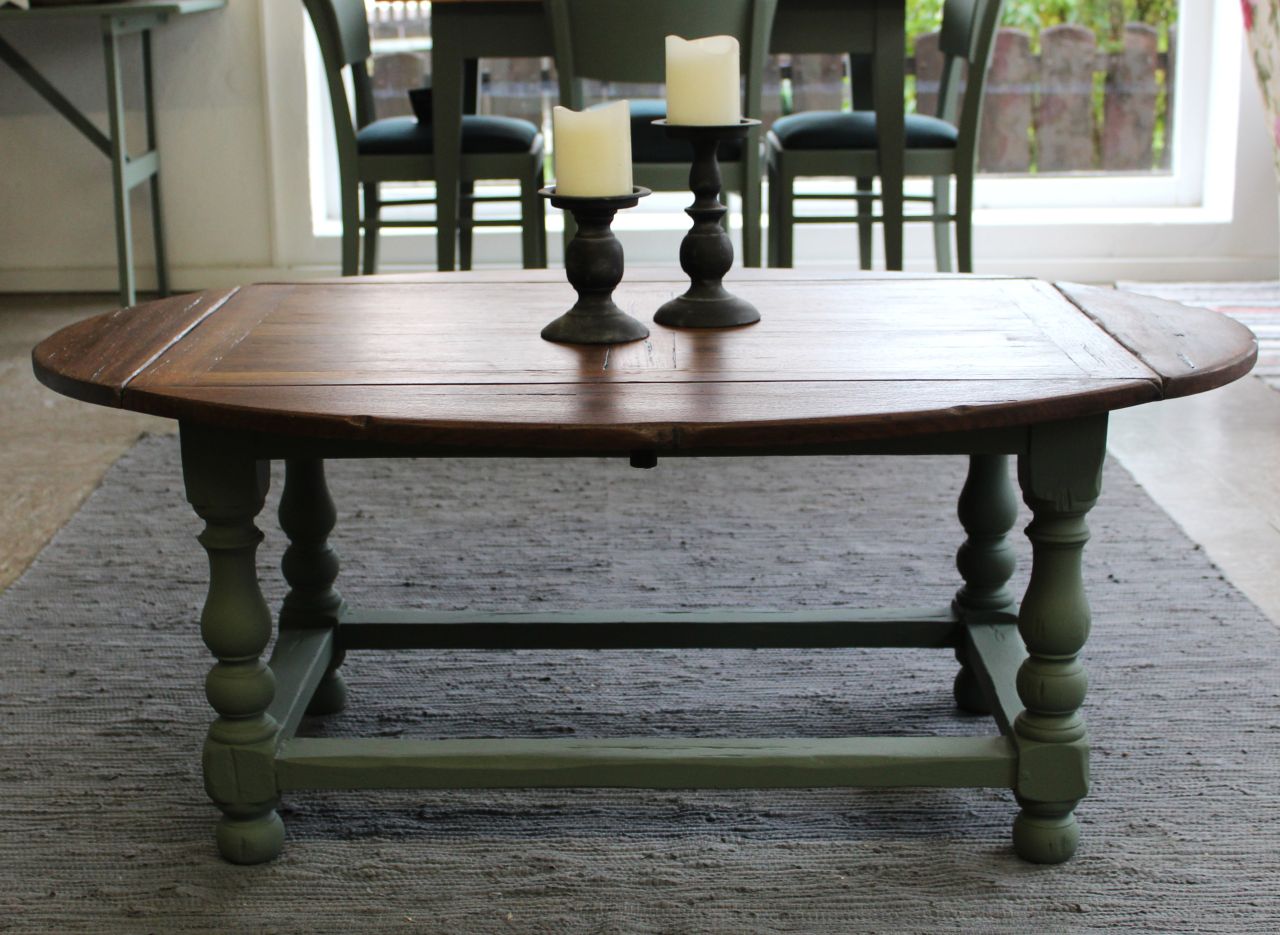 Schöner, antiker Sofatisch mit vier ausklappbaren Brettern zum Vergrößern. Gestaltet haben wir ihn mit Kreidelack (Painting the Past, Camouflage). Die Platte ist frisch geschliffen und neu geölt (lebensmittelechtes Osmo Hartwachs-Öl). Sie ist aus Vollholz, nur die vier Rechtecke in der Platte haben zusätzlich ein Furnier. Zum Vergrößern muss man einfach kleine Holzstützen herausziehen. Verkauf ohne Deko.