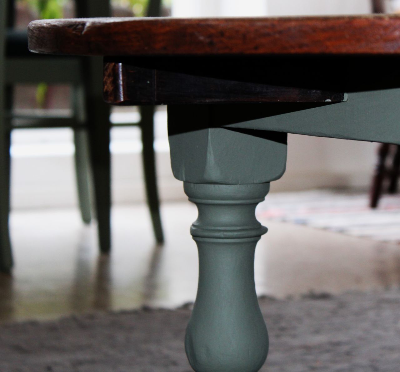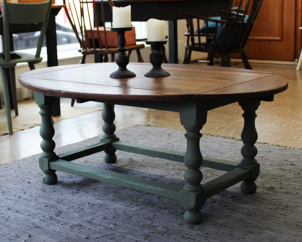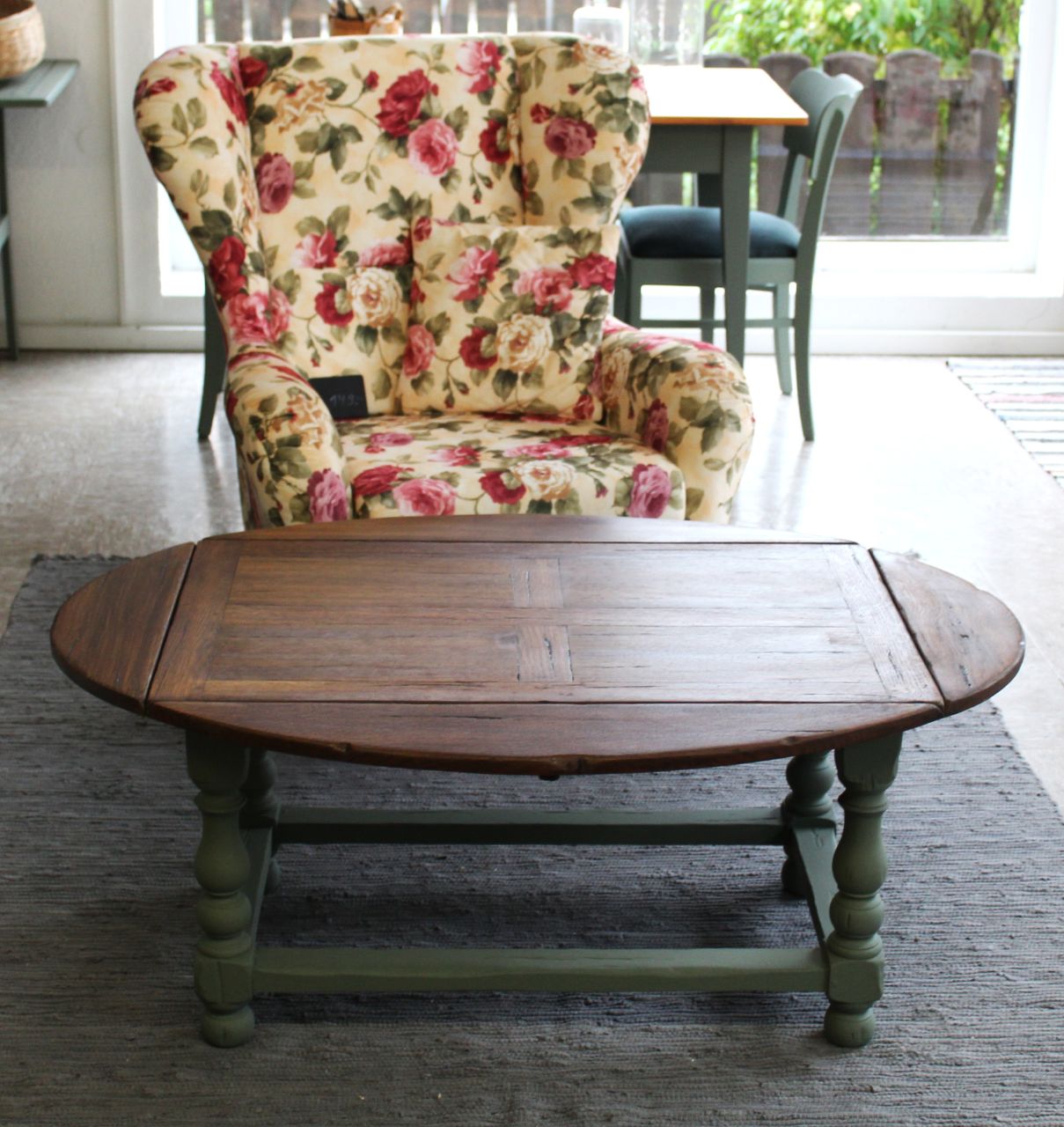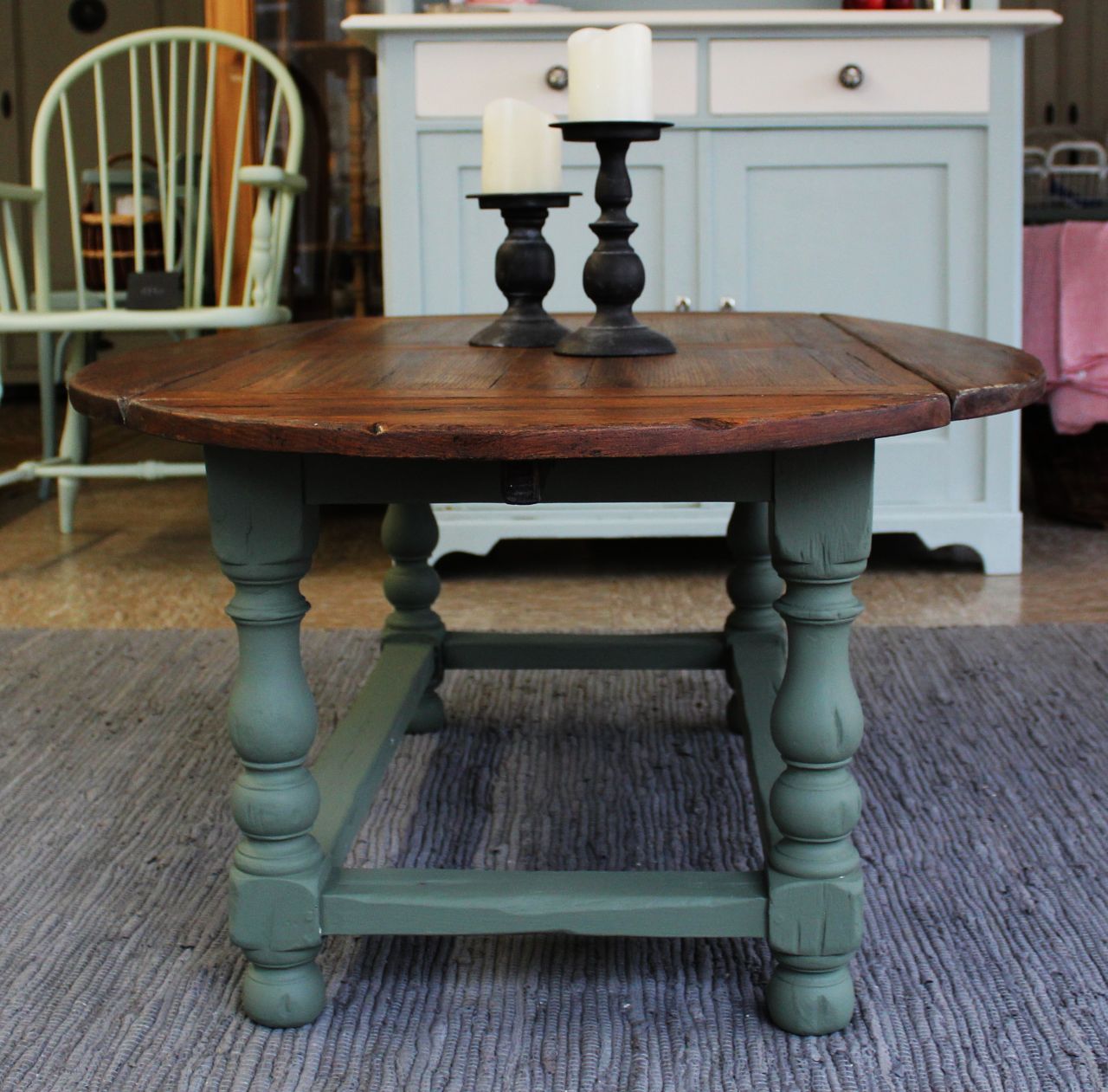 Schöner, antiker Sofatisch mit vier ausklappbaren Brettern zum Vergrößern. Gestaltet haben wir ihn mit Kreidelack (Painting the Past, Camouflage). Die Platte ist frisch geschliffen und neu geölt (lebensmittelechtes Osmo Hartwachs-Öl). Sie ist aus Vollholz, nur die vier Rechtecke in der Platte haben zusätzlich ein Furnier. Zum Vergrößern muss man einfach kleine Holzstützen herausziehen. Verkauf ohne Deko.