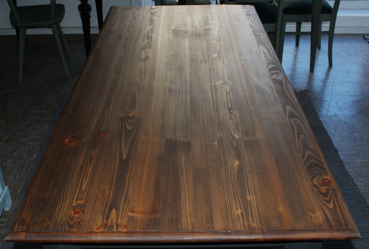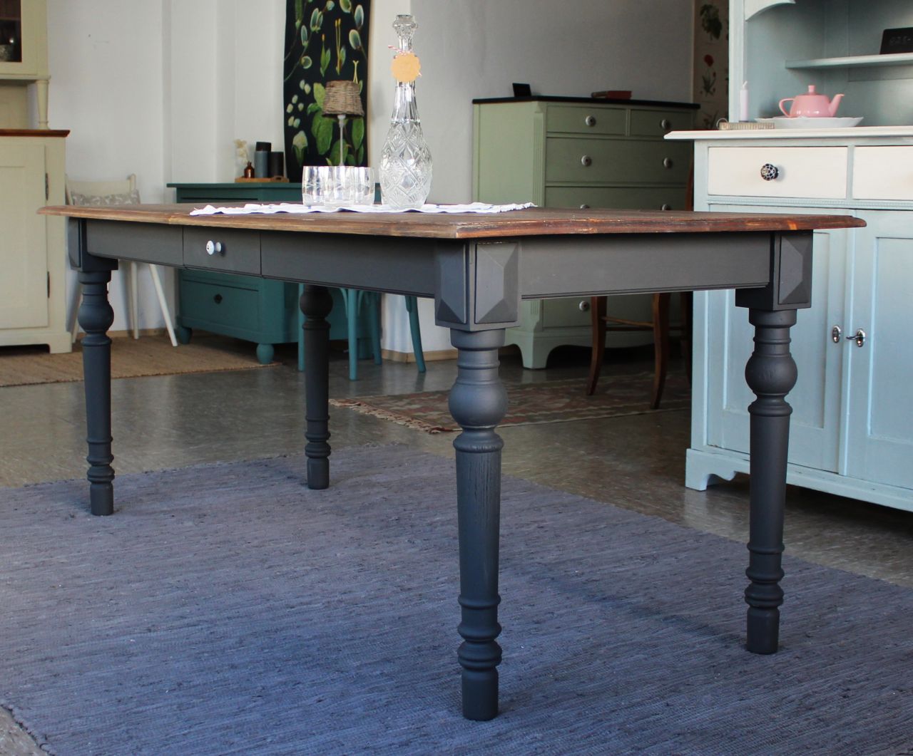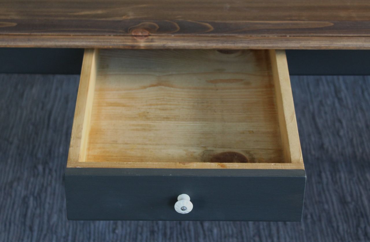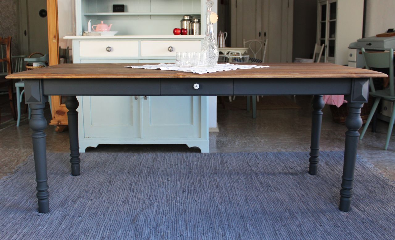 Schöner Vollholz Esstisch (Weichholz) mit einer Schublade. Das Tischgestell haben wir mit Kreidelack (Painting the Past, Urban Black = Schwarz mit einem Grünstich) gestaltet. Die Tischplatte ist frisch geschliffen und neu geölt und gewachst (lebensmittelechtes Osmo Hartwachs-Öl und Bienenwachs). Verkauf ohne Deko.