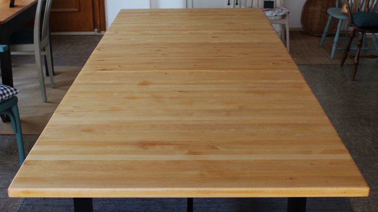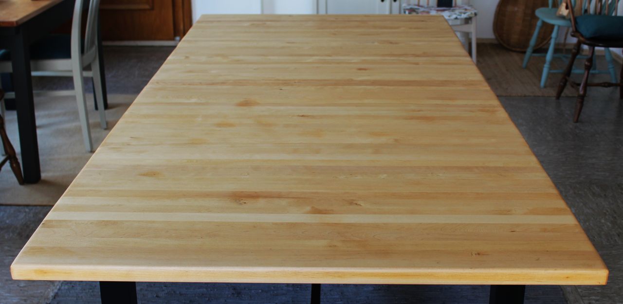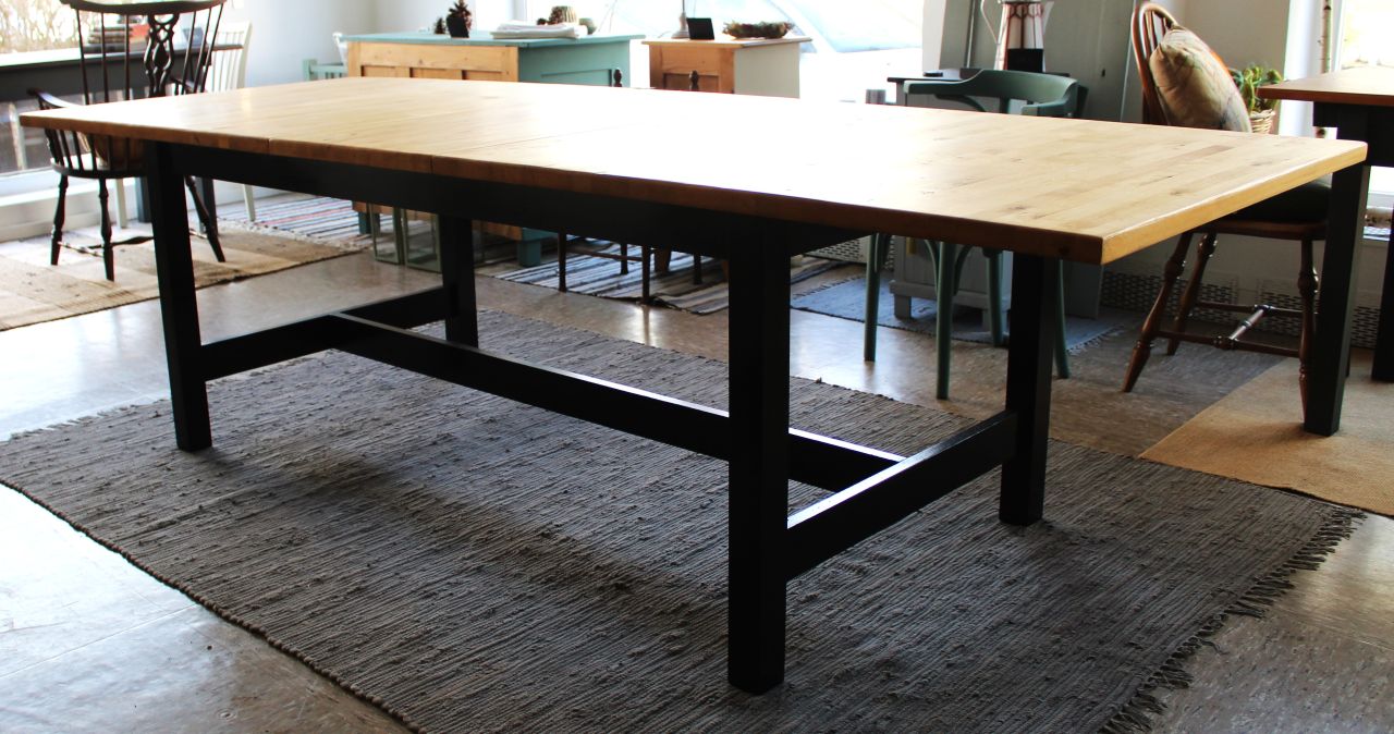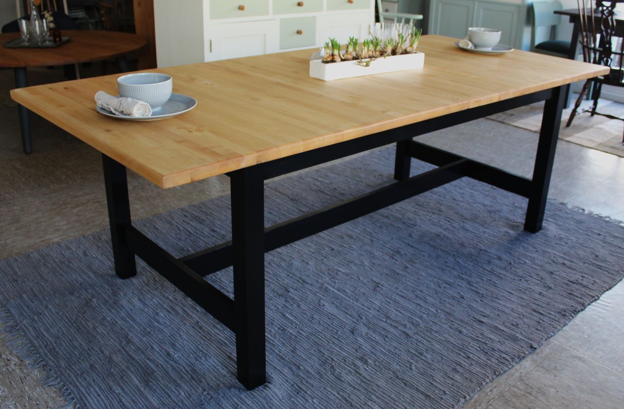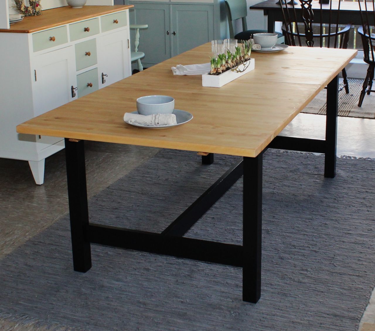 Schöner, großer Vollholz-Küchentisch, der mit einer im Tisch liegenden Einlegeplatte verlängert werden kann. Die Holzart ist vermutlich Weißbuche. Die Platten sind 30 mm stark und deswegen ist der Tisch sehr schwer. Deshalb werden wir beim Versand Tischgestell und Platten trennen. Es müssen dann bei Ihnen 4 kleine Leisten und je 2 Verschlüsse selbst angeschraubt werden. Die Platten sind frisch geschliffen und neu geölt (lebensmittelechtes Osmo Hartwachs-Öl). Das Gestell haben wir mit Kreidelack gestaltet (Painting the Past). Verkauf ohne Deko.