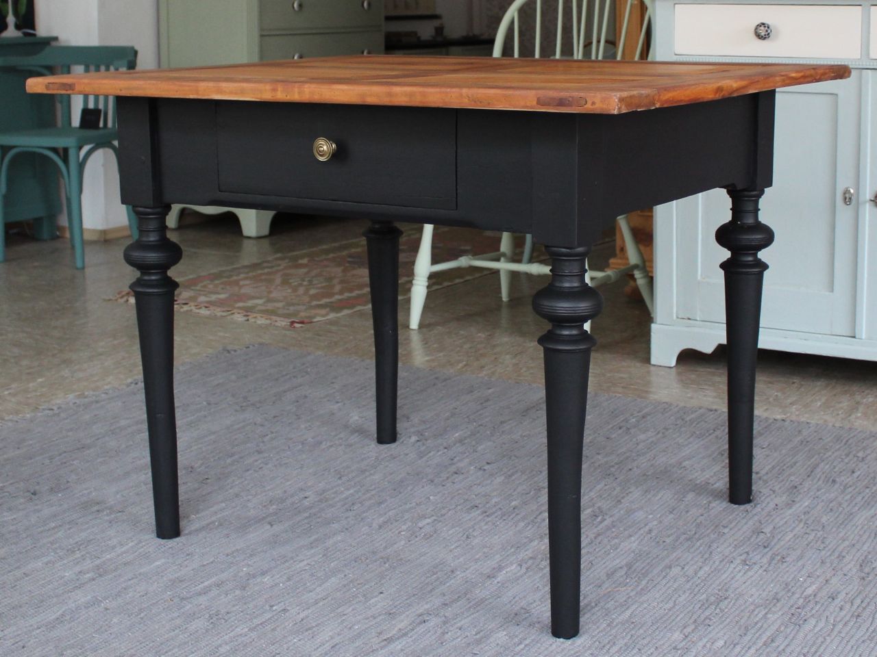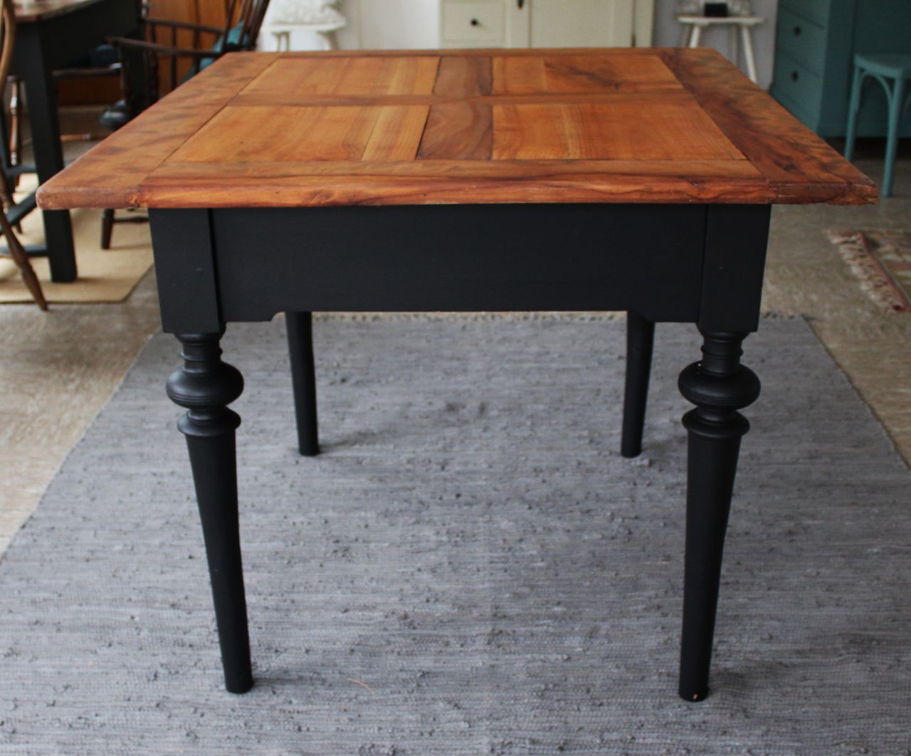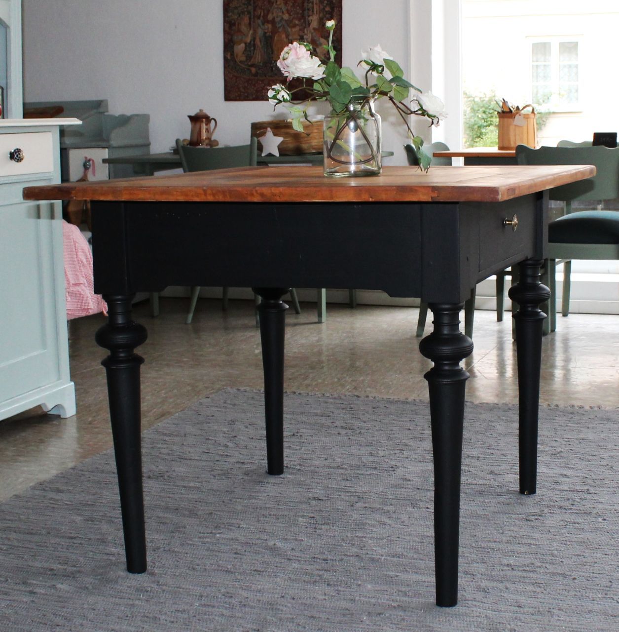 Schöner, antiker Esstisch aus Vollholz, mit einer großen Schublade, hauptsächlich vermutlich aus Apfel- und Kirschbaumholz. Das Gestell haben wir mit Kreidelack gestaltet (Painting the Past, Soft Black). Die Platte ist frisch geschliffen und neu geölt (lebensmittelechtes Osmo Hartwachs-Öl). Die Beine sind nicht 100% gerade, fällt aber nicht weiter auf, der Tisch ist aber fest und stabil. Verkauf ohne Deko.