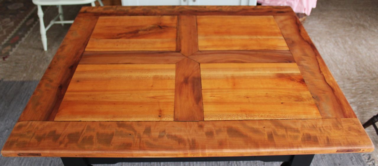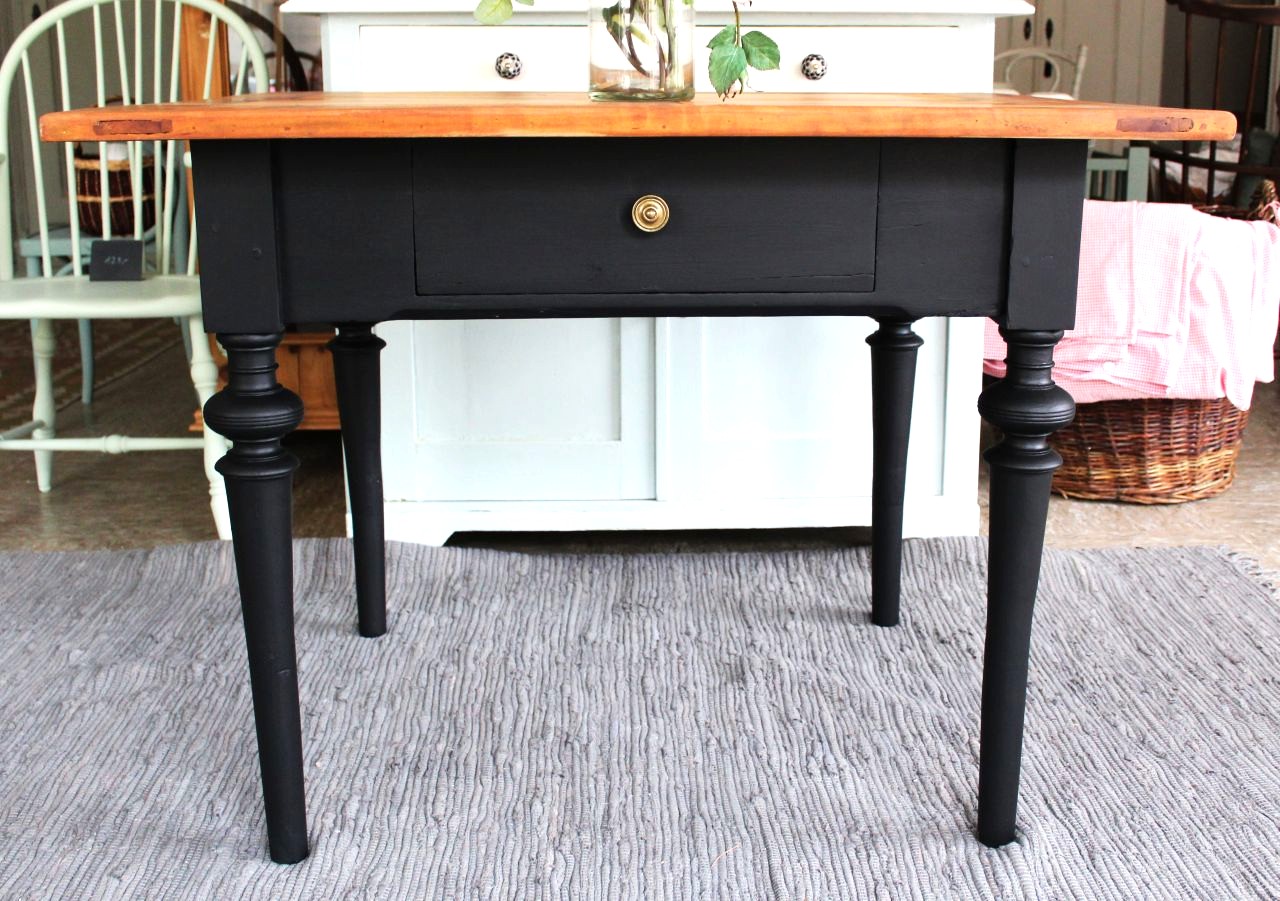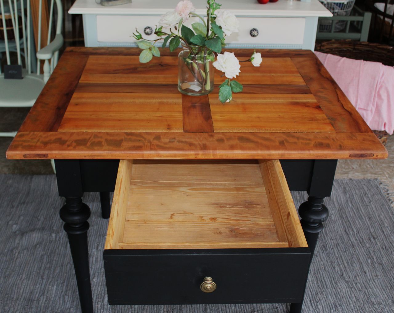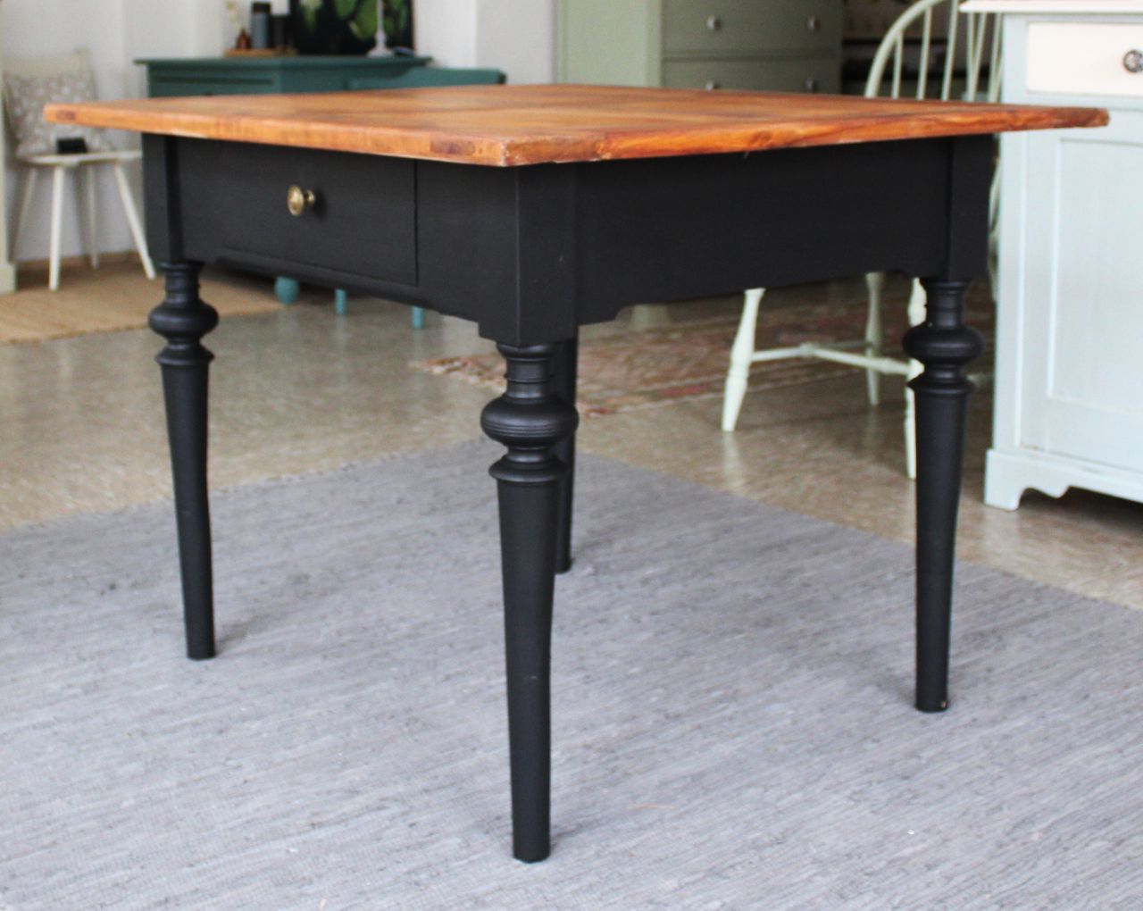 Schöner, antiker Esstisch aus Vollholz, mit einer großen Schublade, hauptsächlich vermutlich aus Apfel- und Kirschbaumholz. Das Gestell haben wir mit Kreidelack gestaltet (Painting the Past, Soft Black). Die Platte ist frisch geschliffen und neu geölt (lebensmittelechtes Osmo Hartwachs-Öl). Die Beine sind nicht 100% gerade, fällt aber nicht weiter auf, der Tisch ist aber fest und stabil. Verkauf ohne Deko.