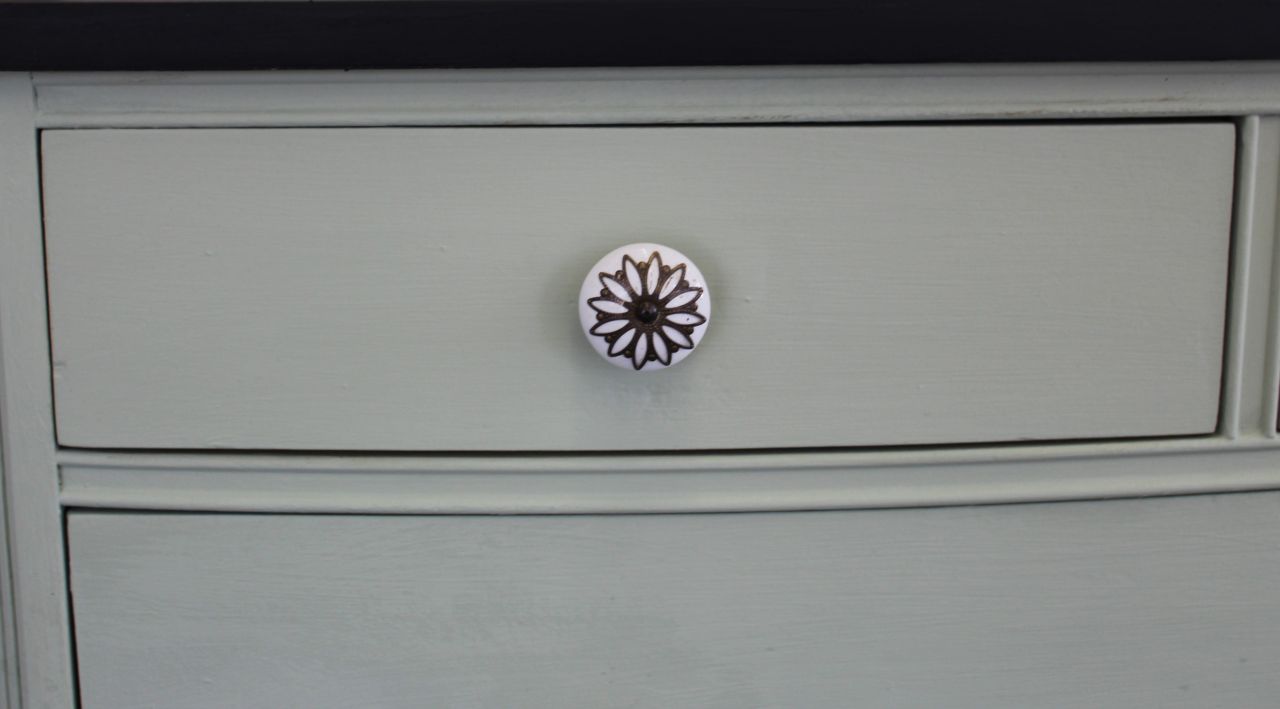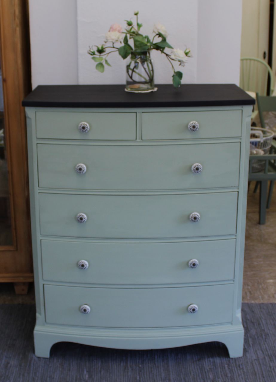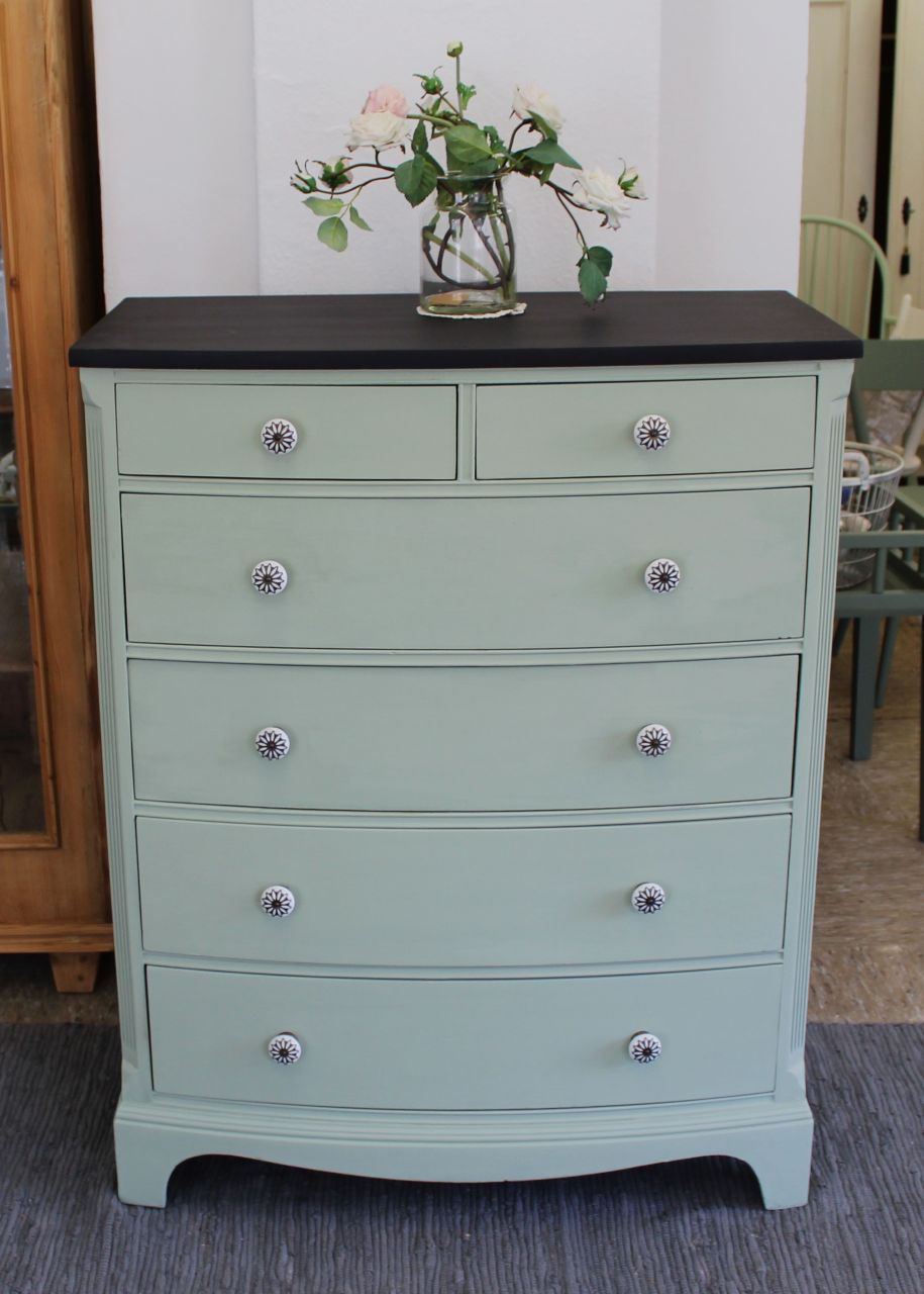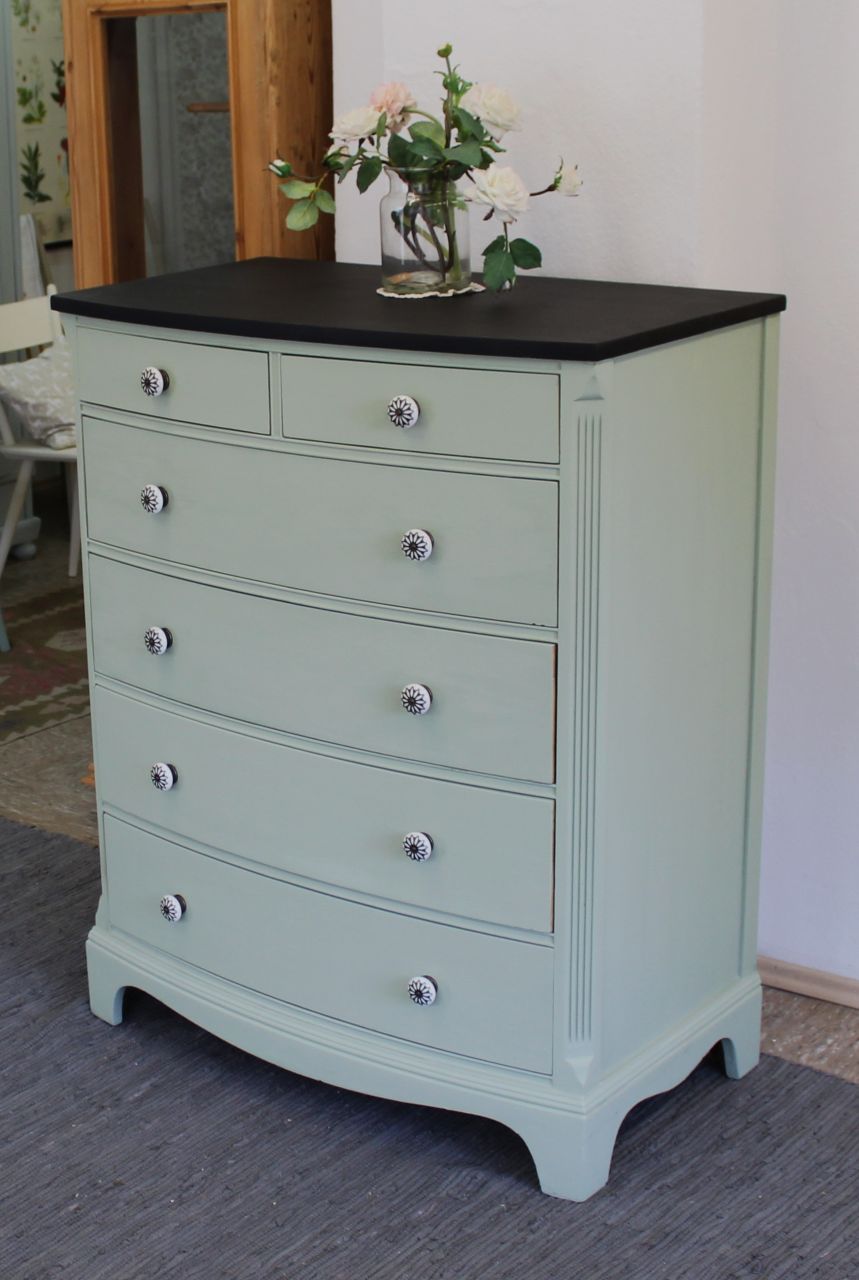 Schöne Schubladenkommode, vermutlich aus den 50er/60er Jahren mit vier großen und 2 kleinen Schubladen (eine der kleinen Schubladen mit einem alten Tuschefleck). Gestaltet haben wir sie mit ökologischer Kreidefarbe (Amazona Evergreen). Versiegelt haben wir sie mit ökologischem Wachsfinish (Amazona). Die Schubladen sind frisch geschliffen und neu gewachst. Die Knöpfe haben wir erneuert. Passend dazu haben wir noch momentan zwei Nachttischchen in einer anderen Anzeige. Verkauf ohne Deko.