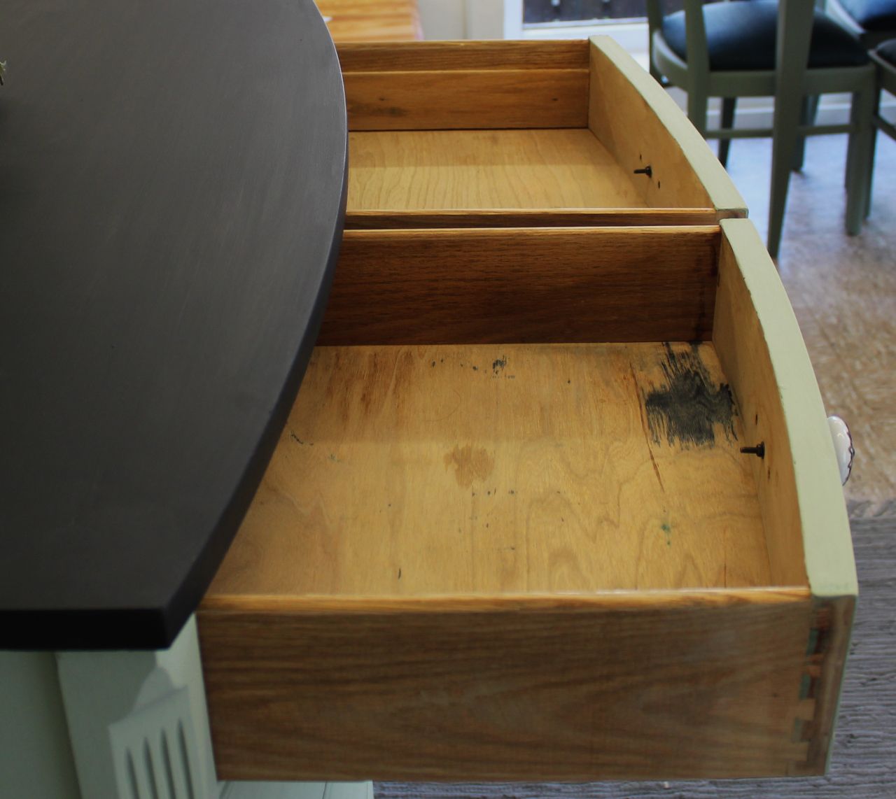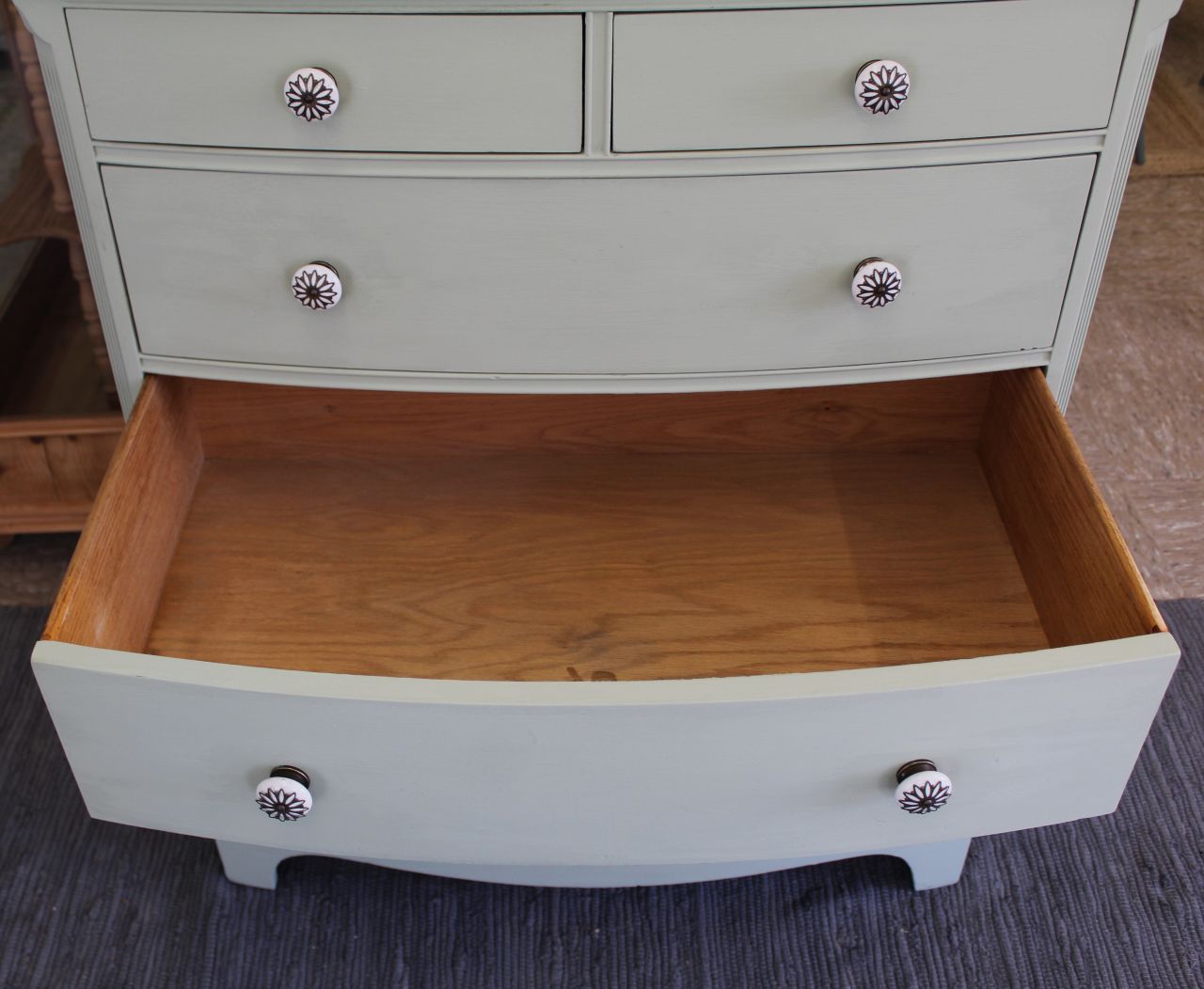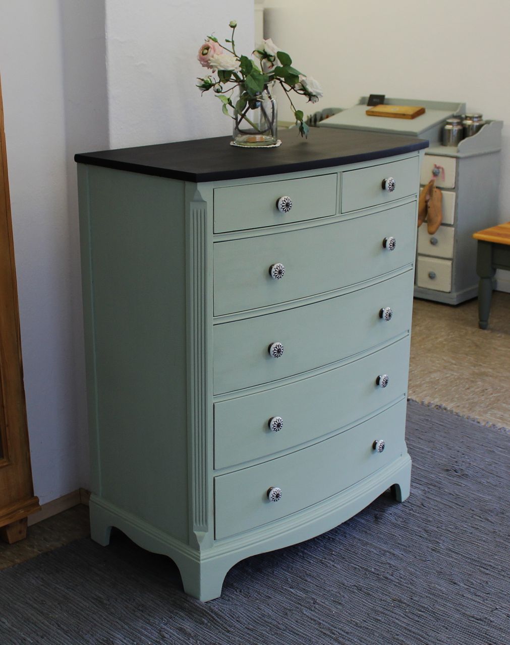 Schöne Schubladenkommode, vermutlich aus den 50er/60er Jahren mit vier großen und 2 kleinen Schubladen (eine der kleinen Schubladen mit einem alten Tuschefleck). Gestaltet haben wir sie mit ökologischer Kreidefarbe (Amazona Evergreen). Versiegelt haben wir sie mit ökologischem Wachsfinish (Amazona). Die Schubladen sind frisch geschliffen und neu gewachst. Die Knöpfe haben wir erneuert. Passend dazu haben wir noch momentan zwei Nachttischchen in einer anderen Anzeige. Verkauf ohne Deko.