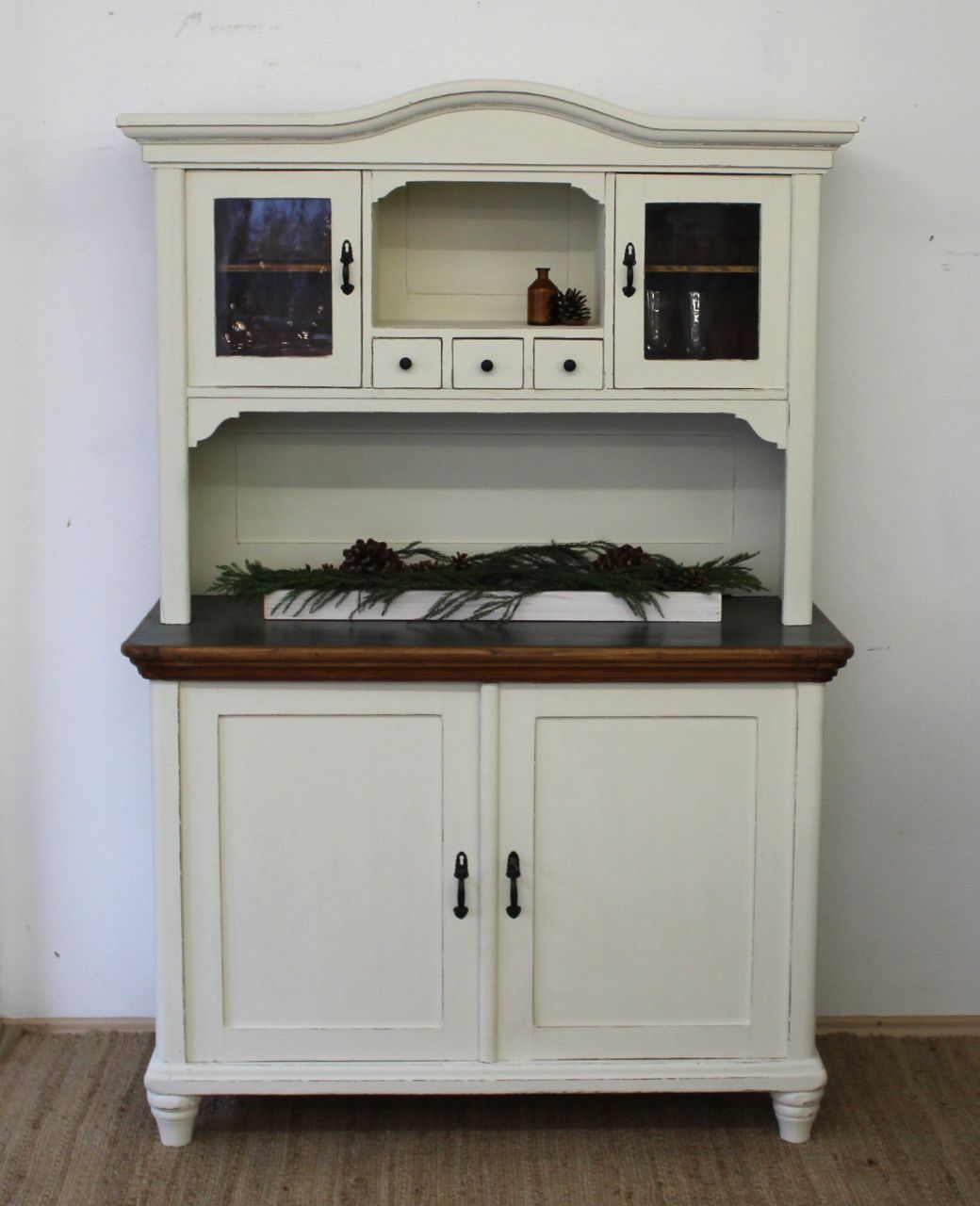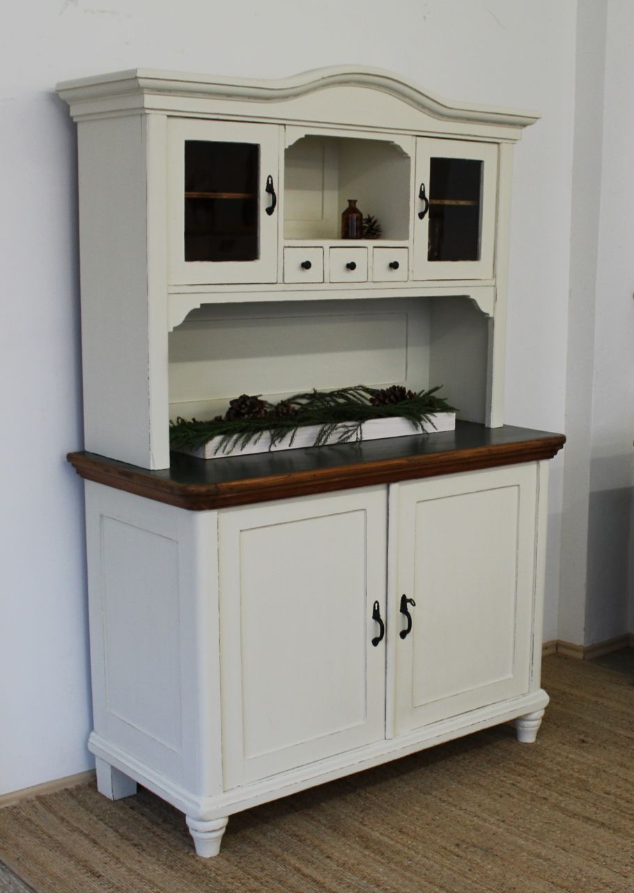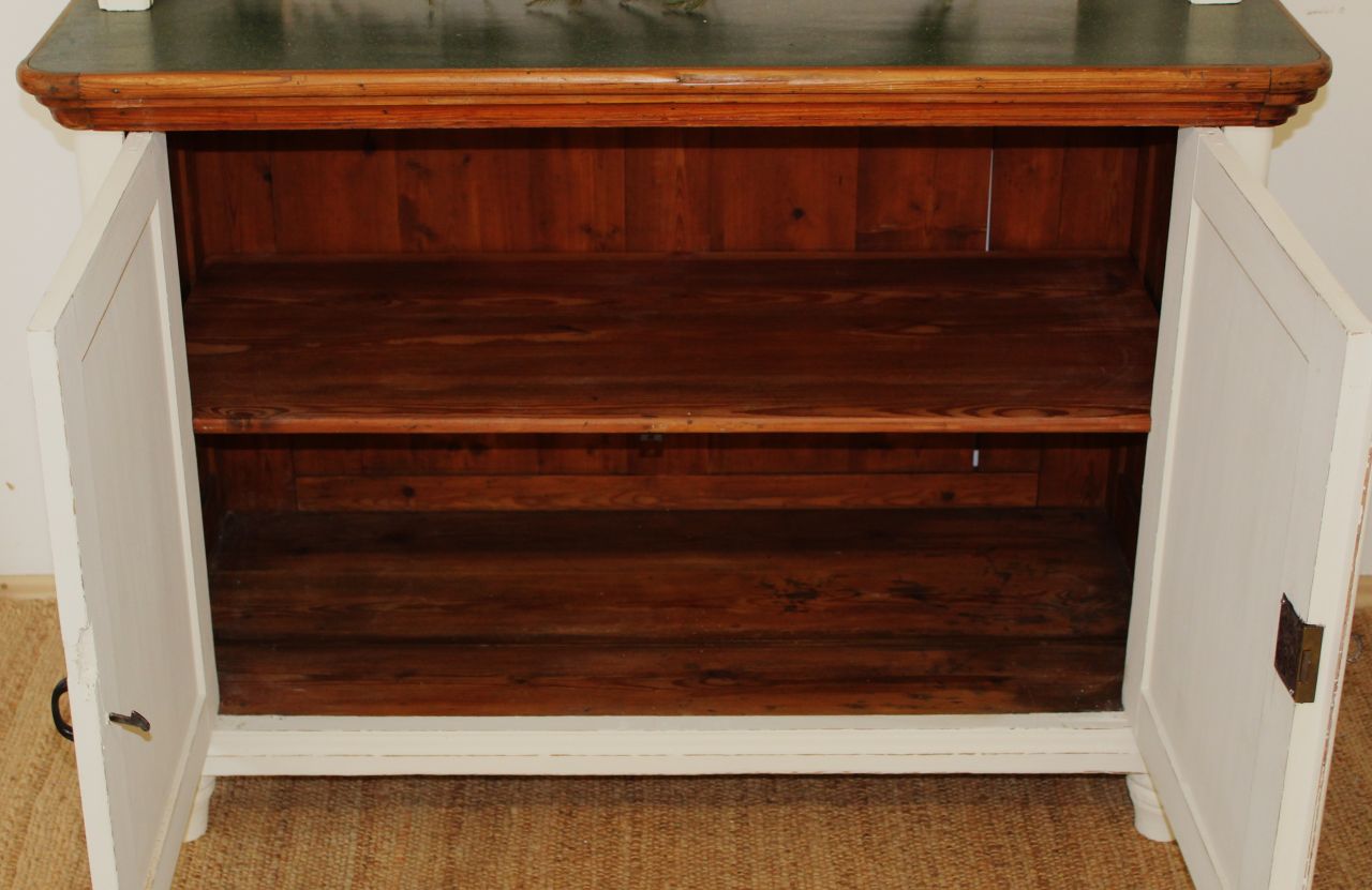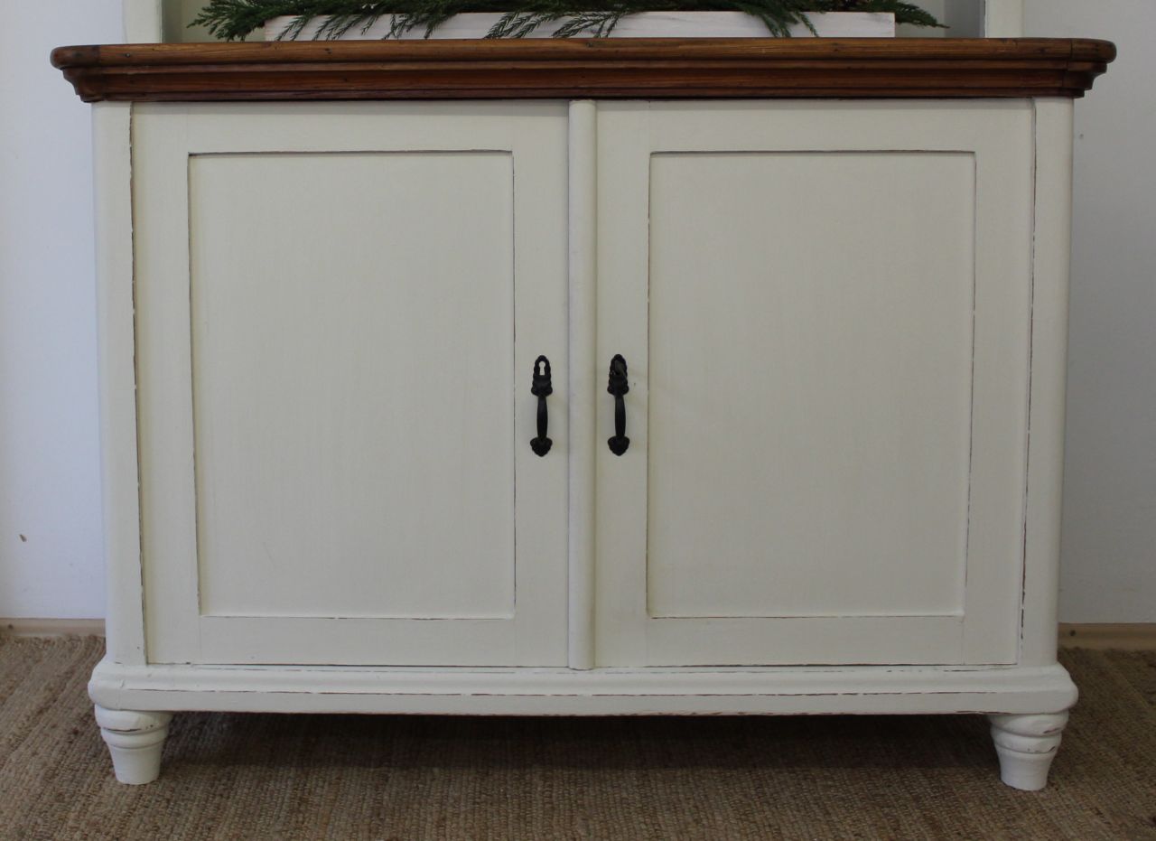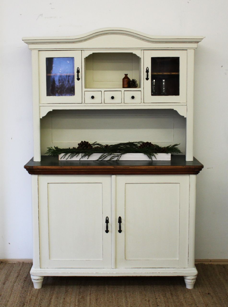 Schöner, antiker Küchenschrank, bestehend aus Ober- und Unterteil. Gestaltet haben wir ihn mit ökologischer Kreidefarbe (Amazona Off-White). Vor dem Versiegeln mit ökologischem, wasserbasiertem Finish haben wir die Kanten angeschliffen. Die Platte und alle sichtbaren Naturholzflächen wurden geschliffen und neu mit lebensmittelechtem Osmo Hartwachs-Öl eingelassen. Das Linoleum der Platte haben wir lackiert (Wasserbasierter Lack). Die Knöpfe der kleinen Schubladen haben wir erneuert. Verkauf ohne Deko.