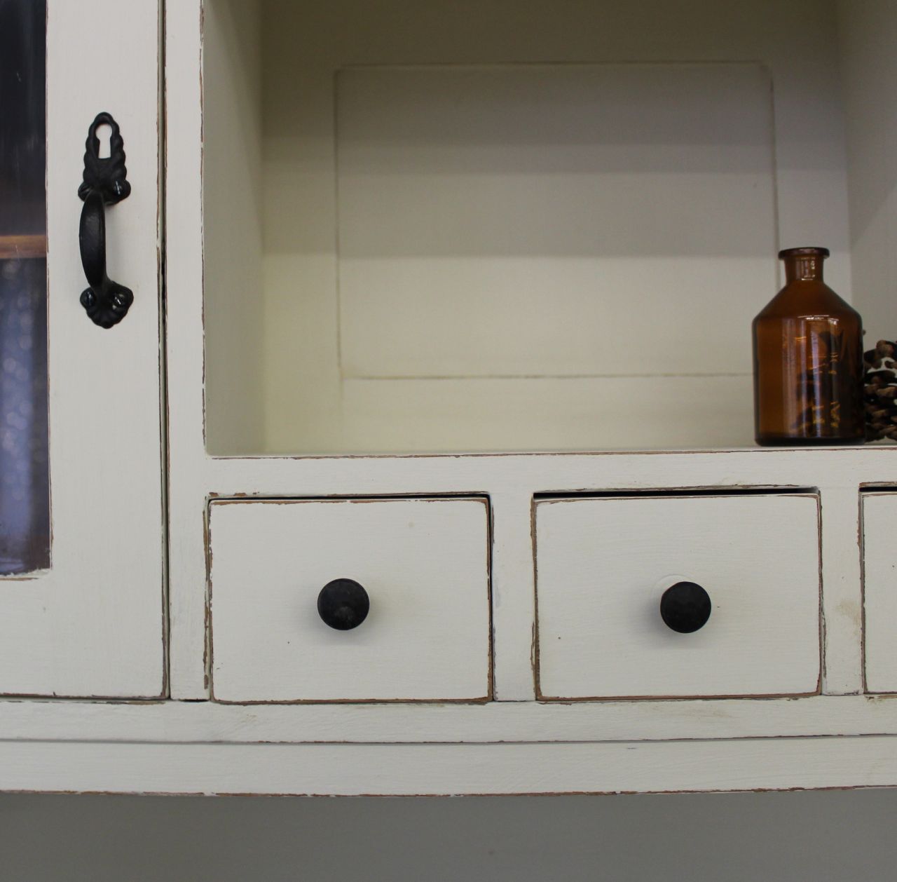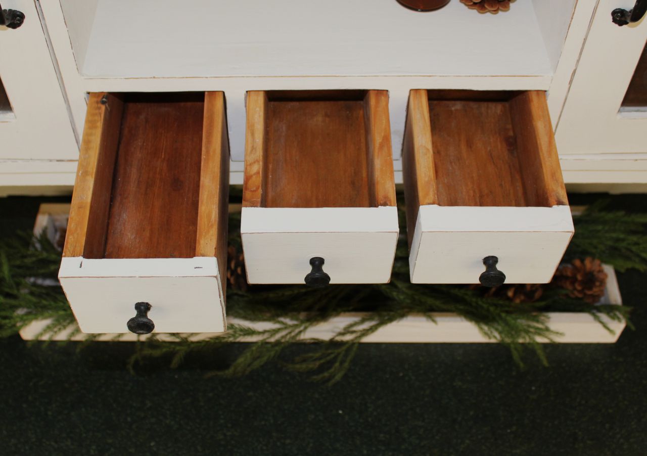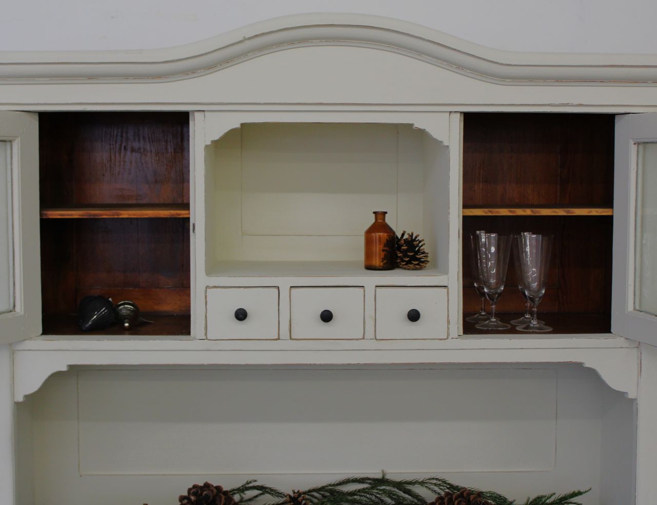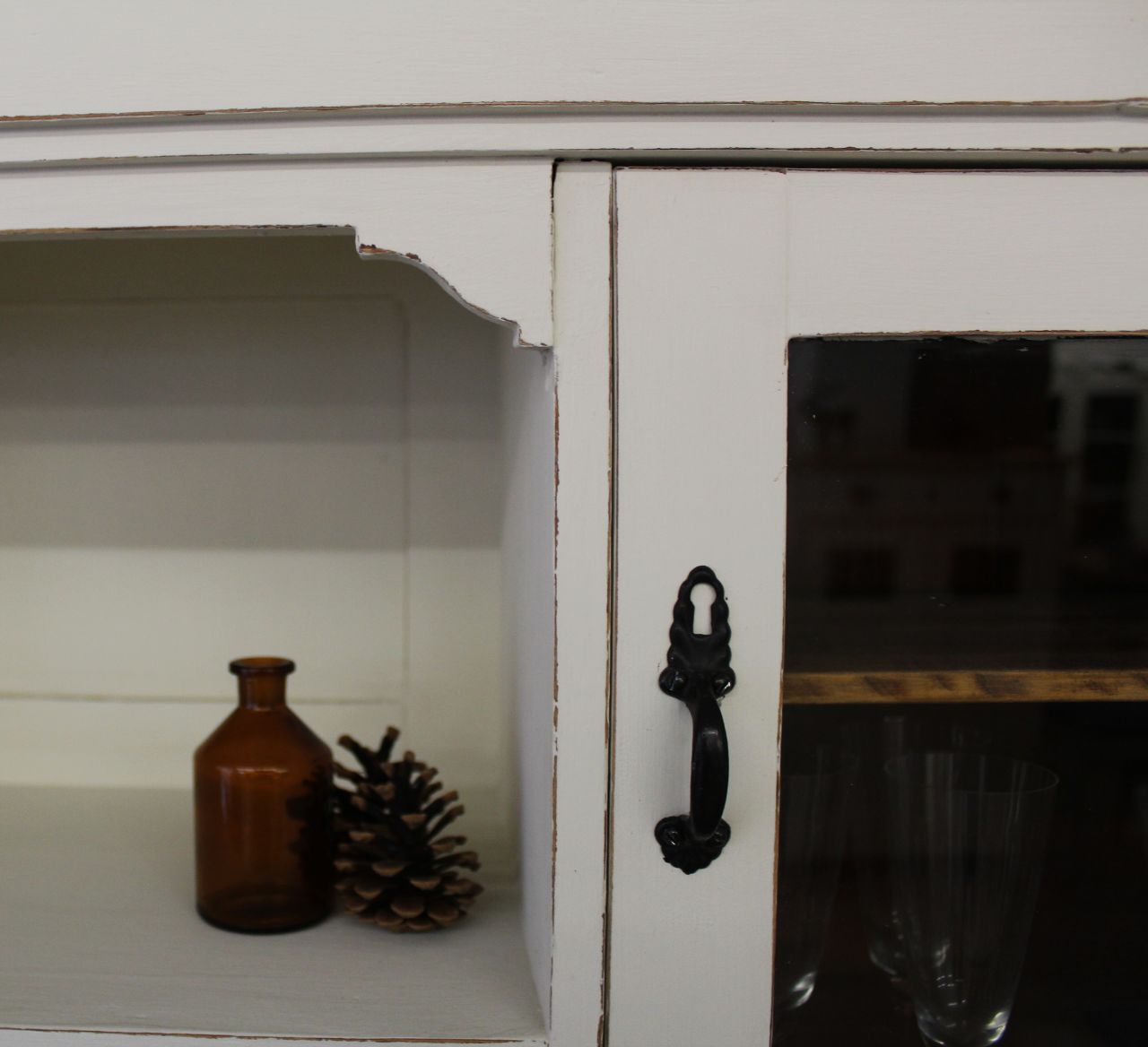 Schöner, antiker Küchenschrank, bestehend aus Ober- und Unterteil. Gestaltet haben wir ihn mit ökologischer Kreidefarbe (Amazona Off-White). Vor dem Versiegeln mit ökologischem, wasserbasiertem Finish haben wir die Kanten angeschliffen. Die Platte und alle sichtbaren Naturholzflächen wurden geschliffen und neu mit lebensmittelechtem Osmo Hartwachs-Öl eingelassen. Das Linoleum der Platte haben wir lackiert (Wasserbasierter Lack). Die Knöpfe der kleinen Schubladen haben wir erneuert. Verkauf ohne Deko.