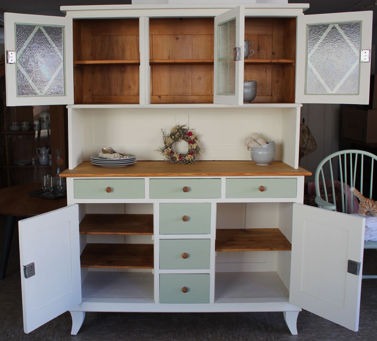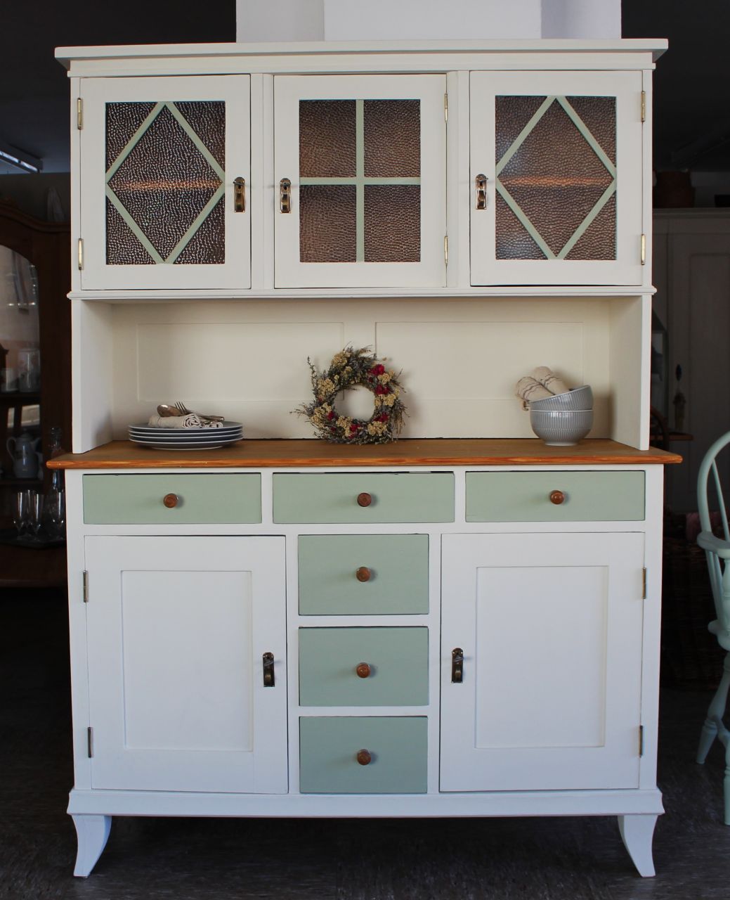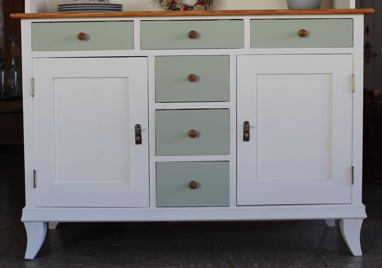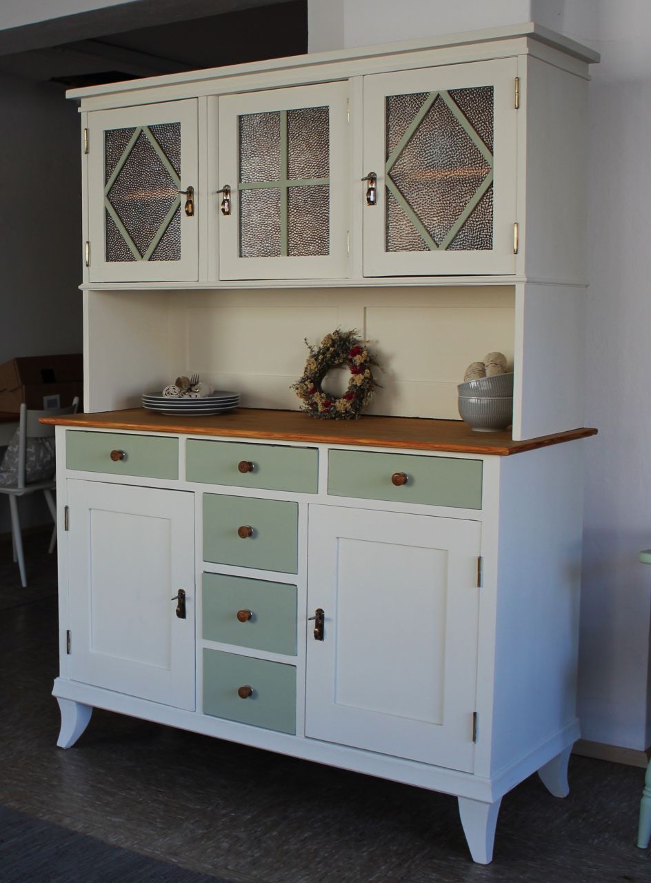 Schöner, antiker Küchenschrank, bestehend aus Unter- und Oberteil, mit 6 Schubladen. Gestaltet haben wir ihn mit ökologischer Kreidefarbe (Amazona Off-White und Evergreen). Als Versiegelung haben wir ökologisches Amazona-Finish verwendet. Innen oben ist frisch geschliffen und neu geölt. Teils sind noch antike Verfärbungen im Holz zu sehen. Innen unten haben wir weißen Kreidelack verwendet. Die Schlößer und Schlüsselschilder haben wir erneuert. Verkauf ohne Deko.