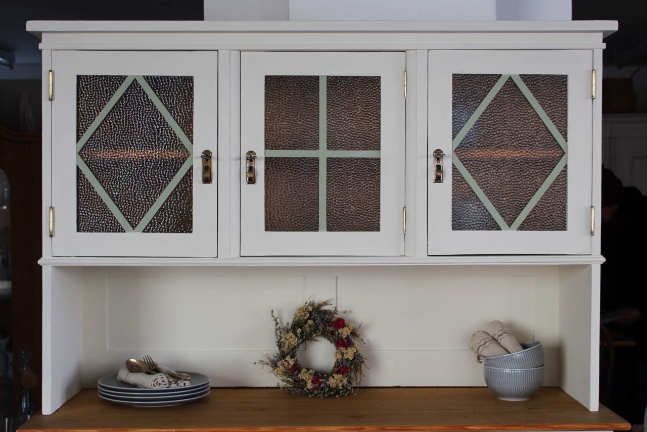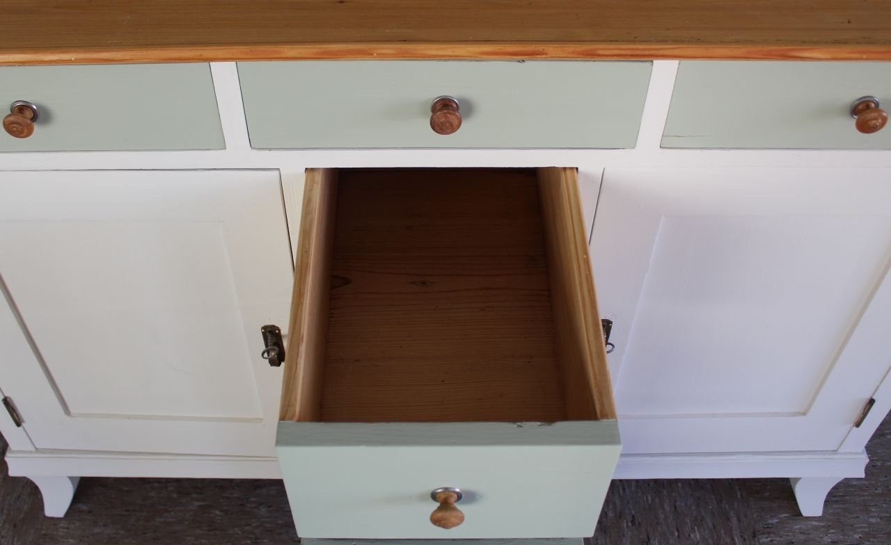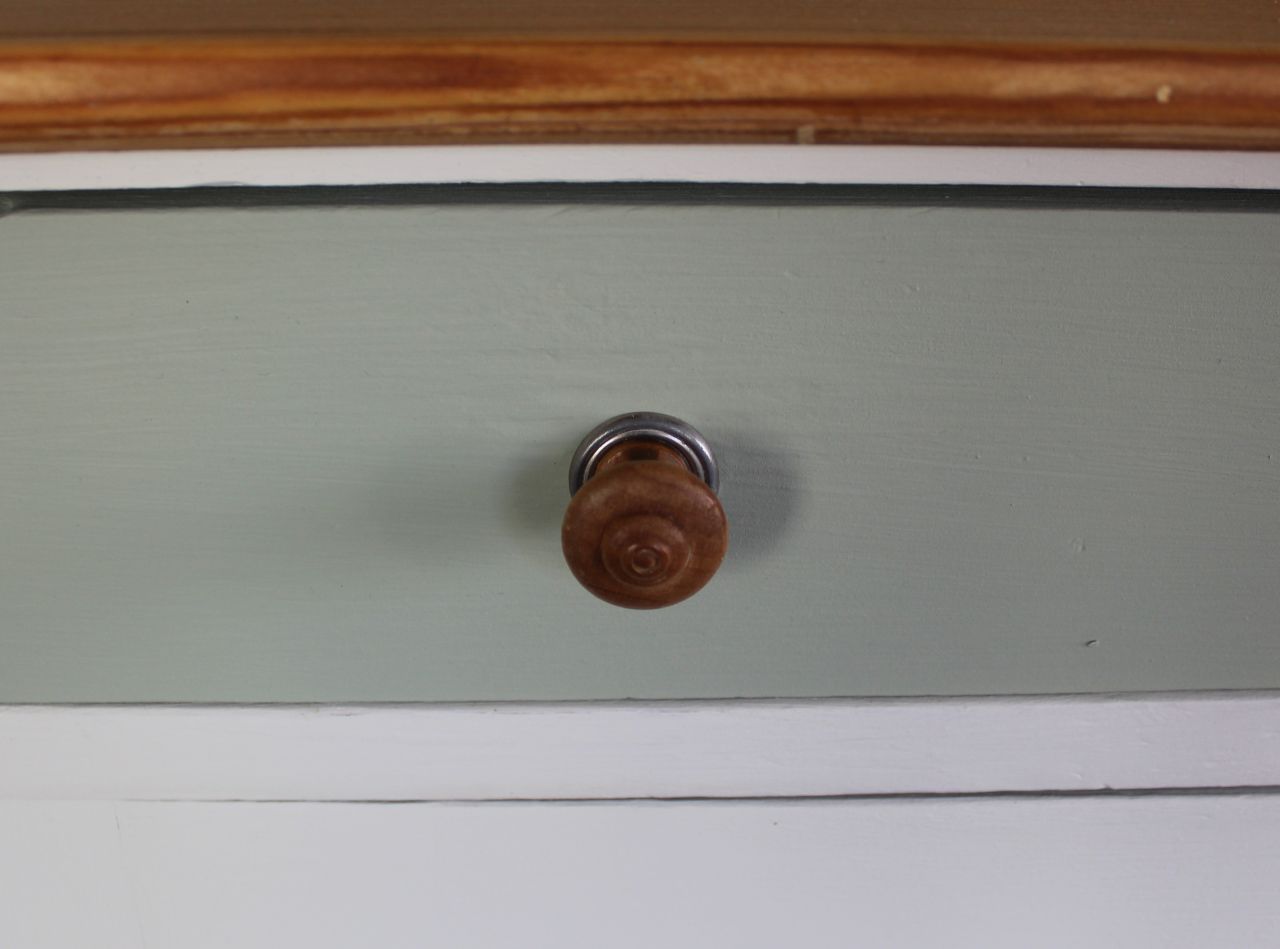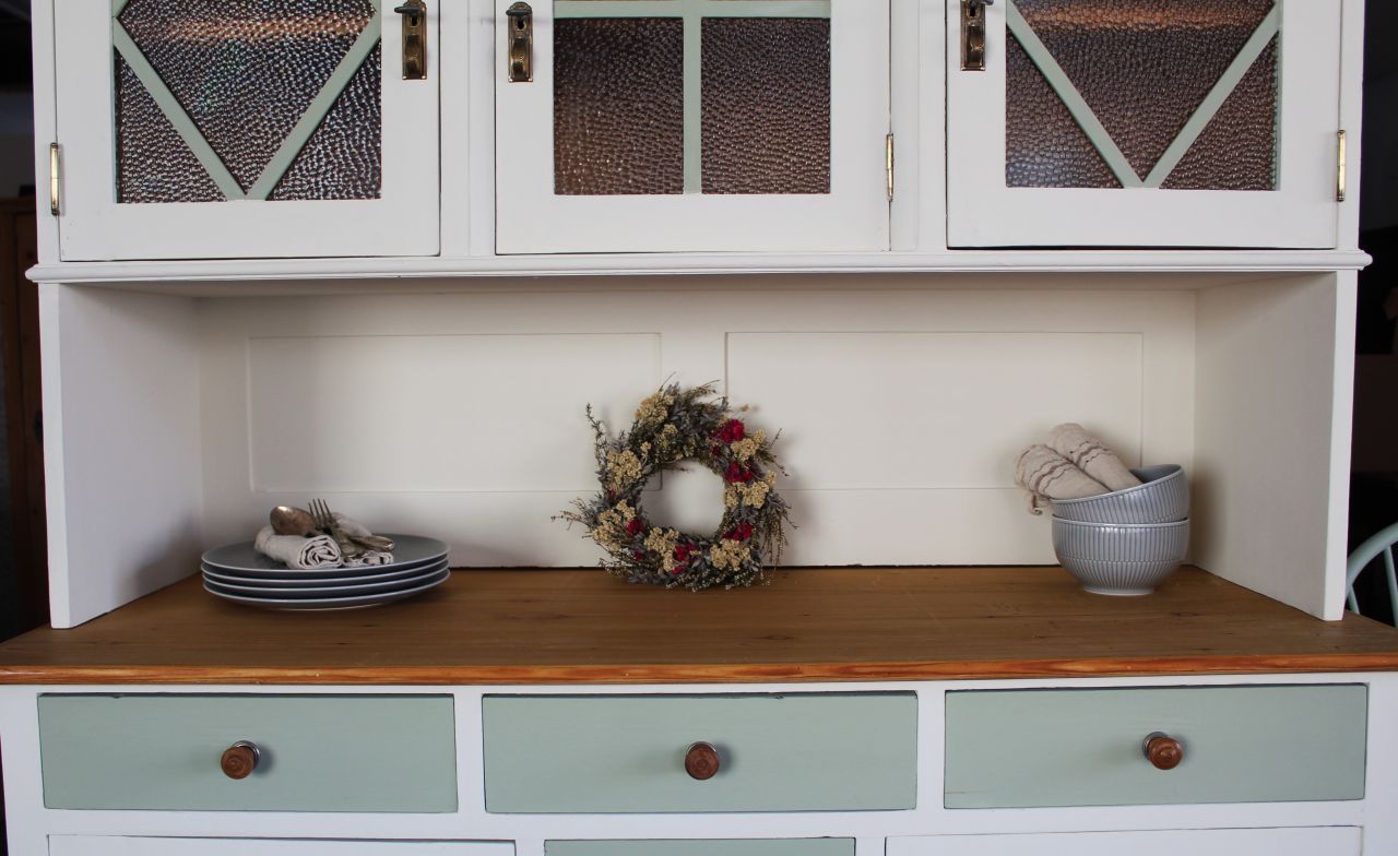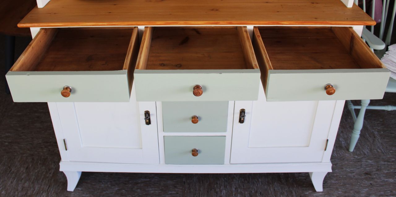 Schöner, antiker Küchenschrank, bestehend aus Unter- und Oberteil, mit 6 Schubladen. Gestaltet haben wir ihn mit ökologischer Kreidefarbe (Amazona Off-White und Evergreen). Als Versiegelung haben wir ökologisches Amazona-Finish verwendet. Innen oben ist frisch geschliffen und neu geölt. Teils sind noch antike Verfärbungen im Holz zu sehen. Innen unten haben wir weißen Kreidelack verwendet. Die Schlößer und Schlüsselschilder haben wir erneuert. Verkauf ohne Deko.