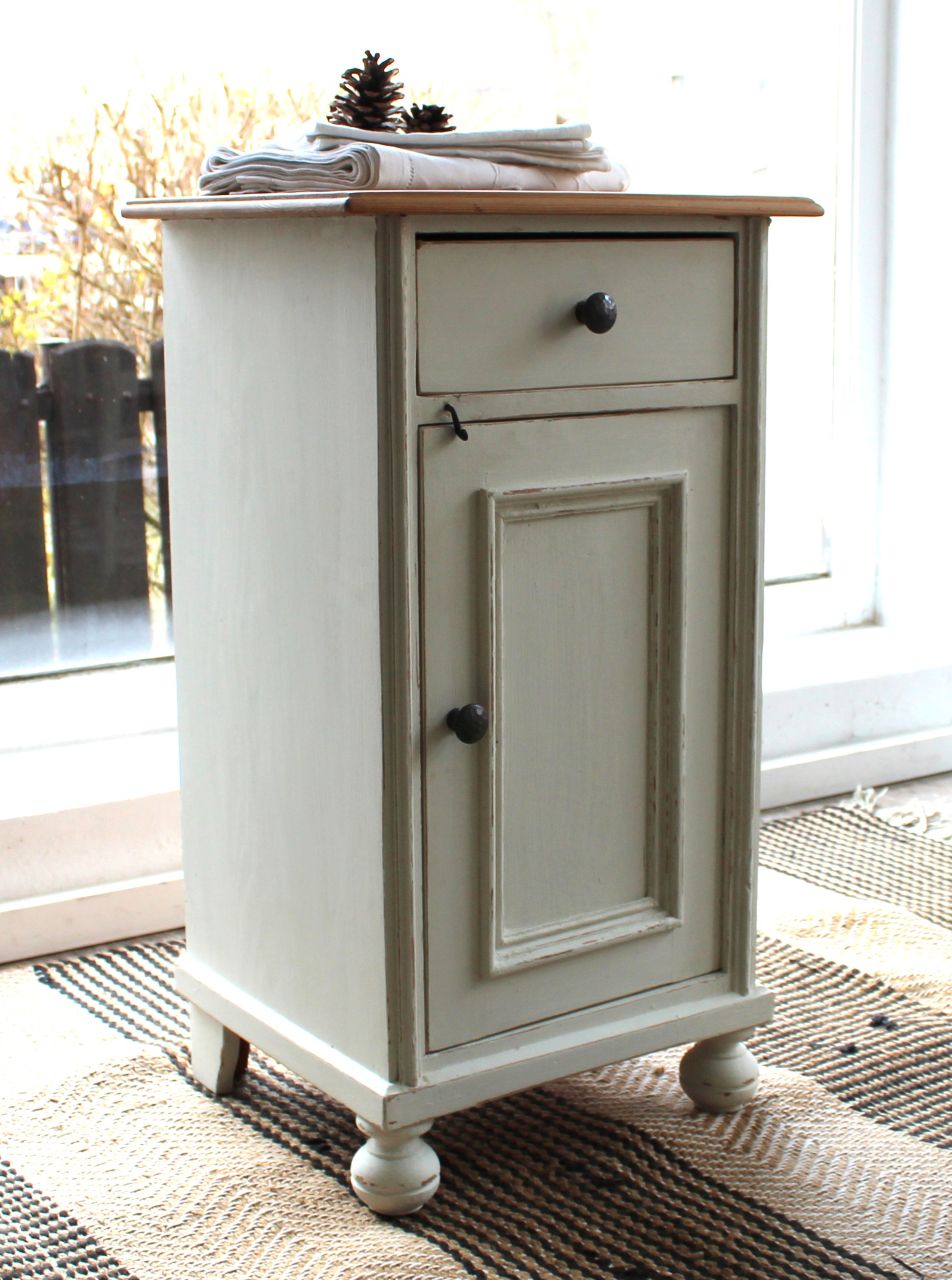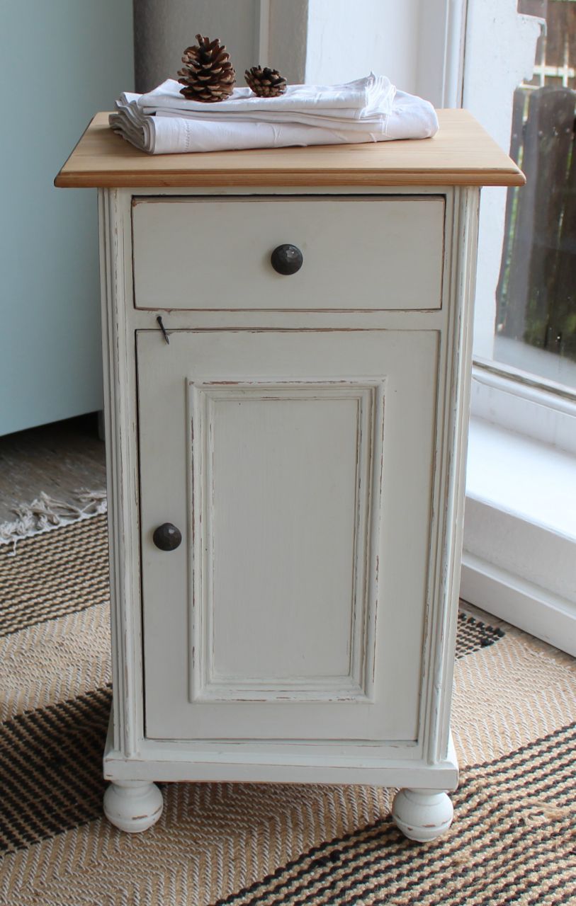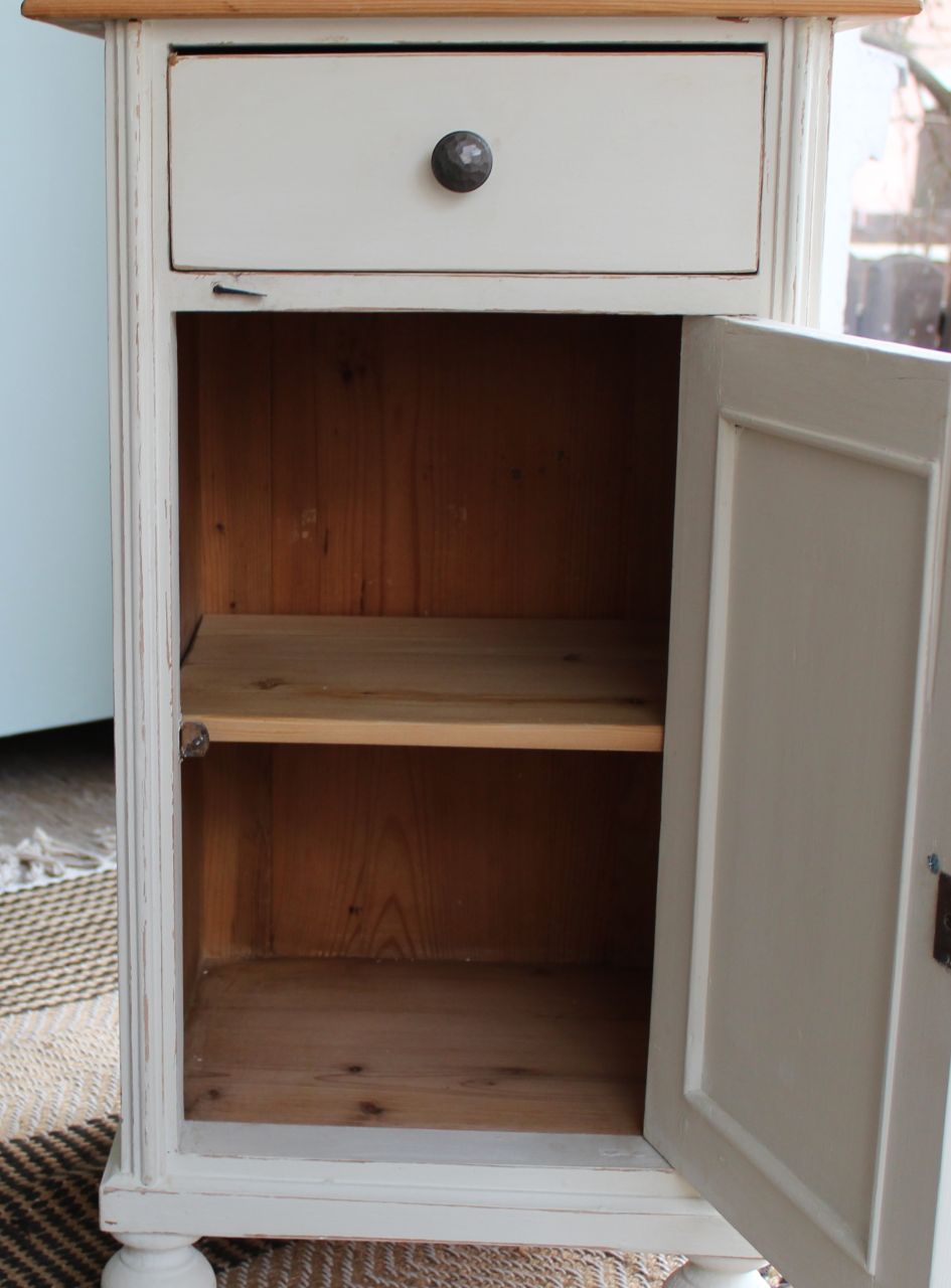 Schönes, antikes Nachtschränkchen mit einer Schublade und einem Fachbrett. Gestaltet haben wir es mit ökologischer Kreidefarbe (Amazona Off-White). Vor dem Versiegeln mit Bienenwachs haben wir die Kanten angeschliffen. Die Knöpfe haben wir erneuert. Innen und die Platte oben wurde frisch geschliffen und neu gewachst. Verkauf ohne Deko.