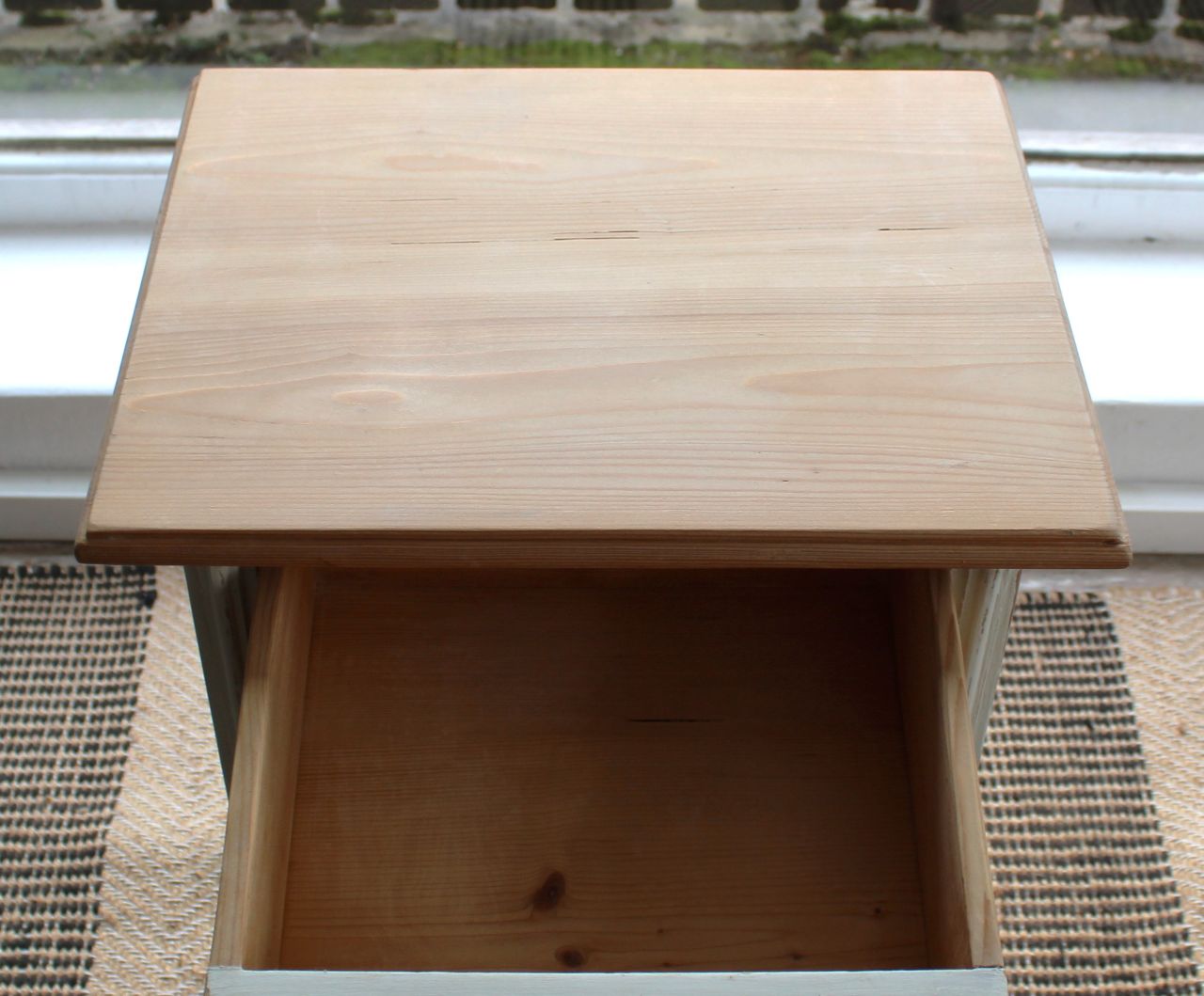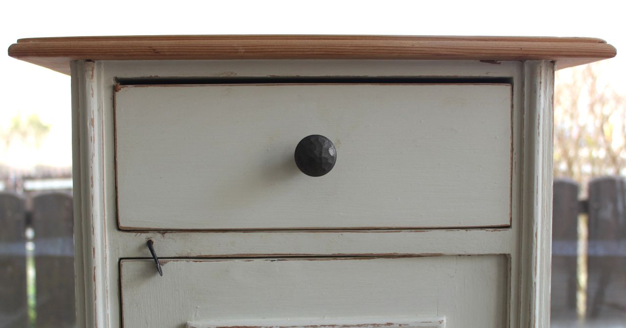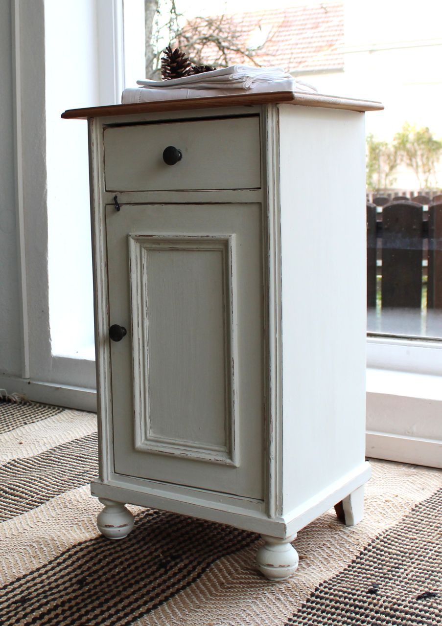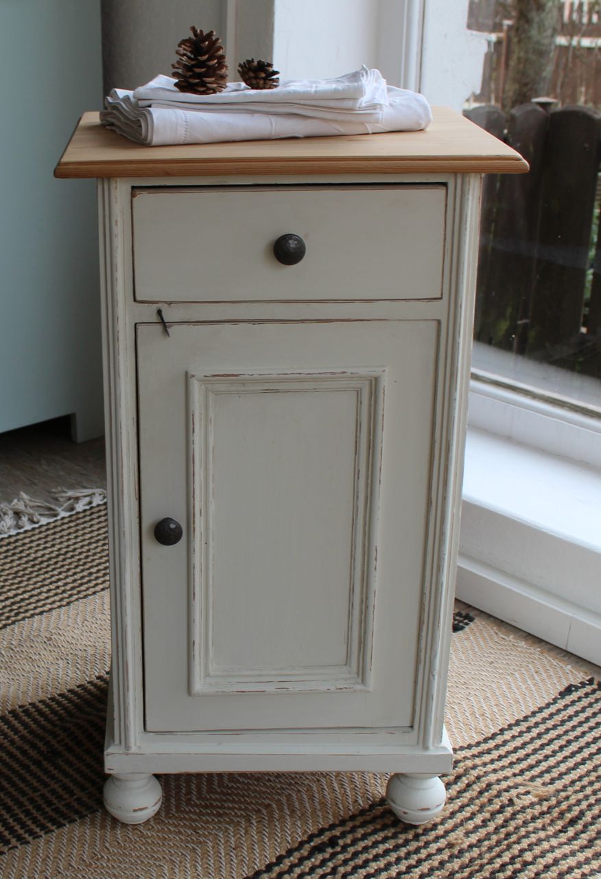 Schönes, antikes Nachtschränkchen mit einer Schublade und einem Fachbrett. Gestaltet haben wir es mit ökologischer Kreidefarbe (Amazona Off-White). Vor dem Versiegeln mit Bienenwachs haben wir die Kanten angeschliffen. Die Knöpfe haben wir erneuert. Innen und die Platte oben wurde frisch geschliffen und neu gewachst. Verkauf ohne Deko.