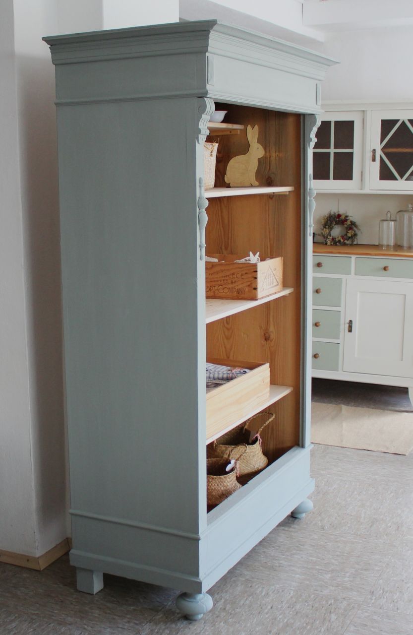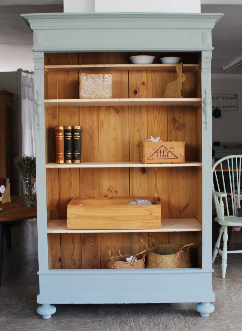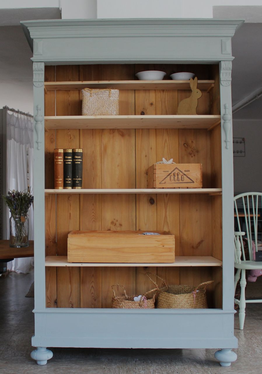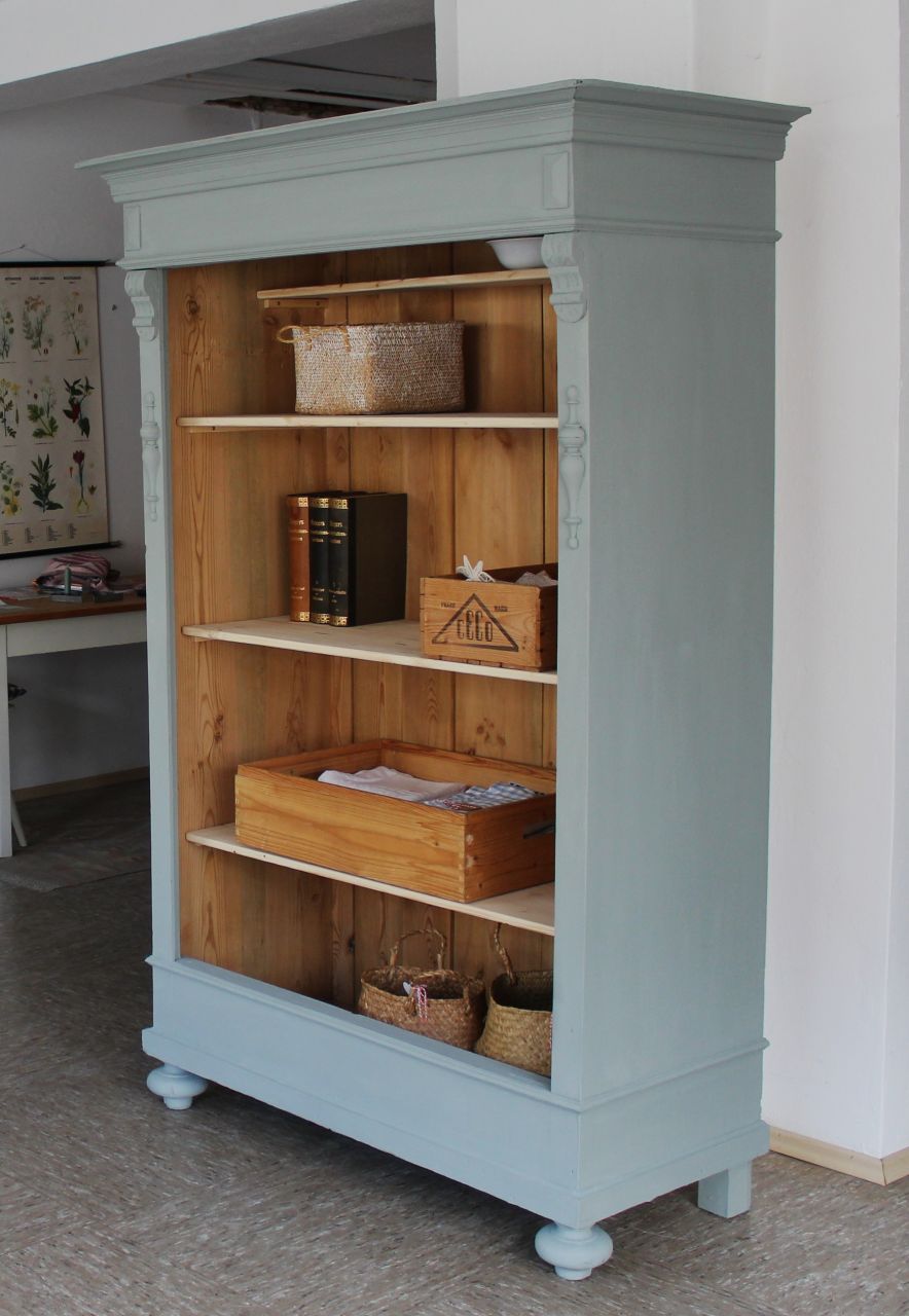 Schönes, antikes Schrankregal mit 4 Fachbrettern. Gestaltet haben wir mit ökologischer Kreidefarbe (Amazona, selbstgemischtes Aqua). Als Versiegelung haben wir ökologisches Eco-Finish verwendet. Die Fachbretter haben wir erneuert. Verkauf ohne Deko.