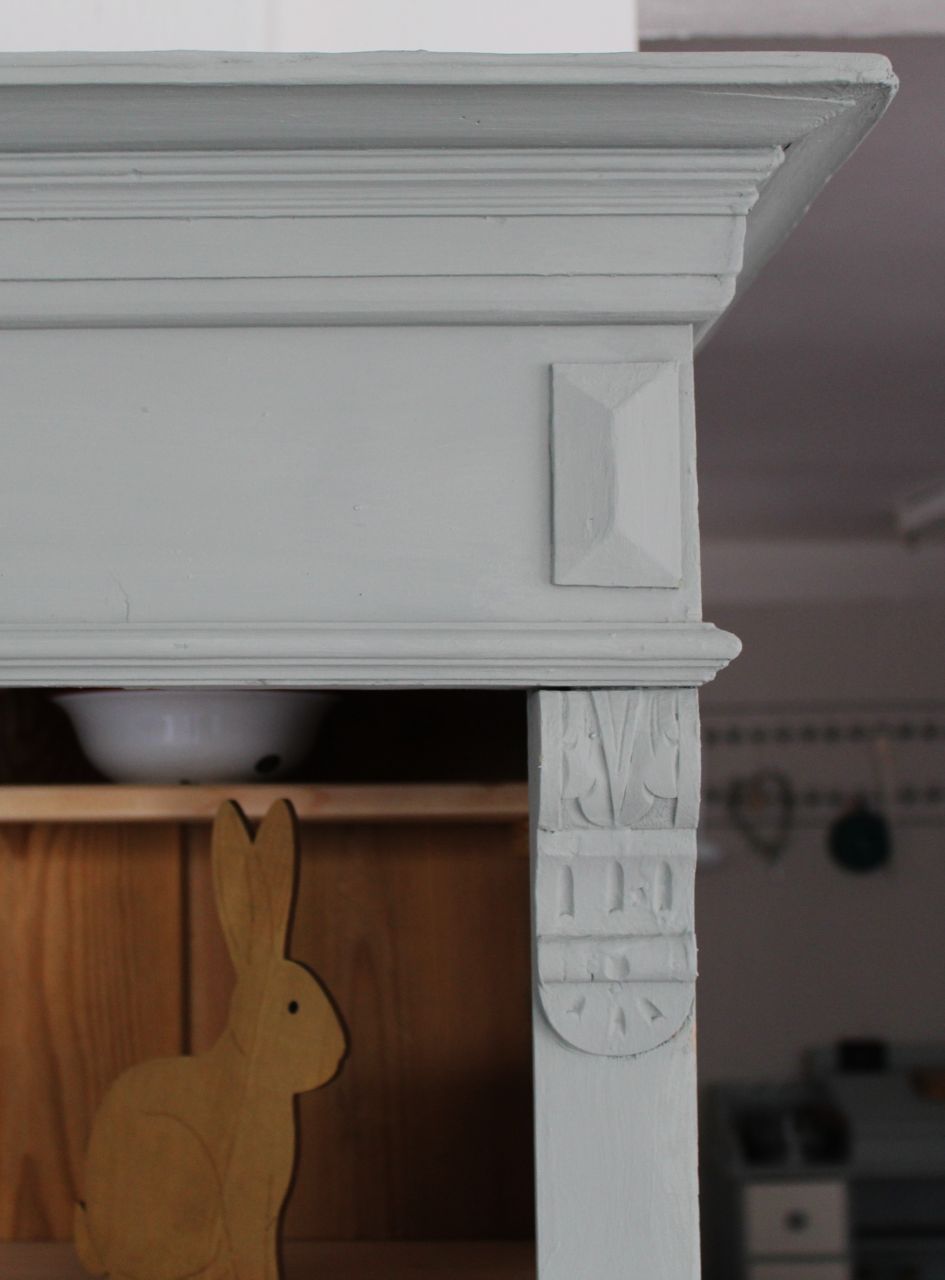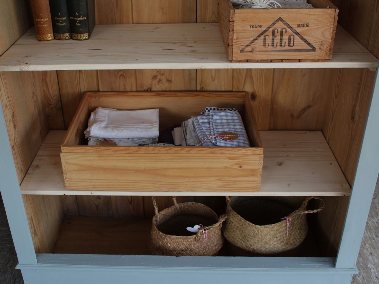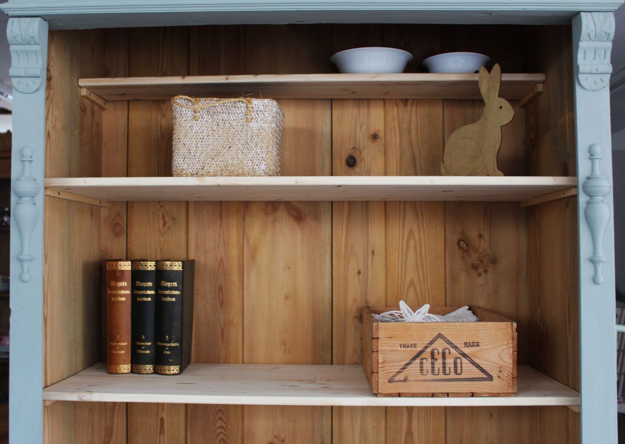 Schönes, antikes Schrankregal mit 4 Fachbrettern. Gestaltet haben wir mit ökologischer Kreidefarbe (Amazona, selbstgemischtes Aqua). Als Versiegelung haben wir ökologisches Eco-Finish verwendet. Die Fachbretter haben wir erneuert. Verkauf ohne Deko.
