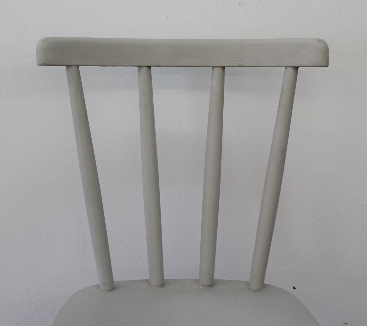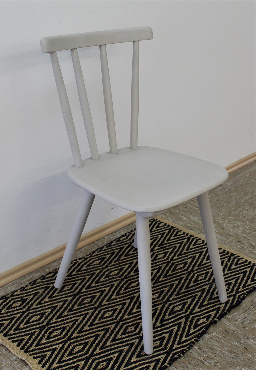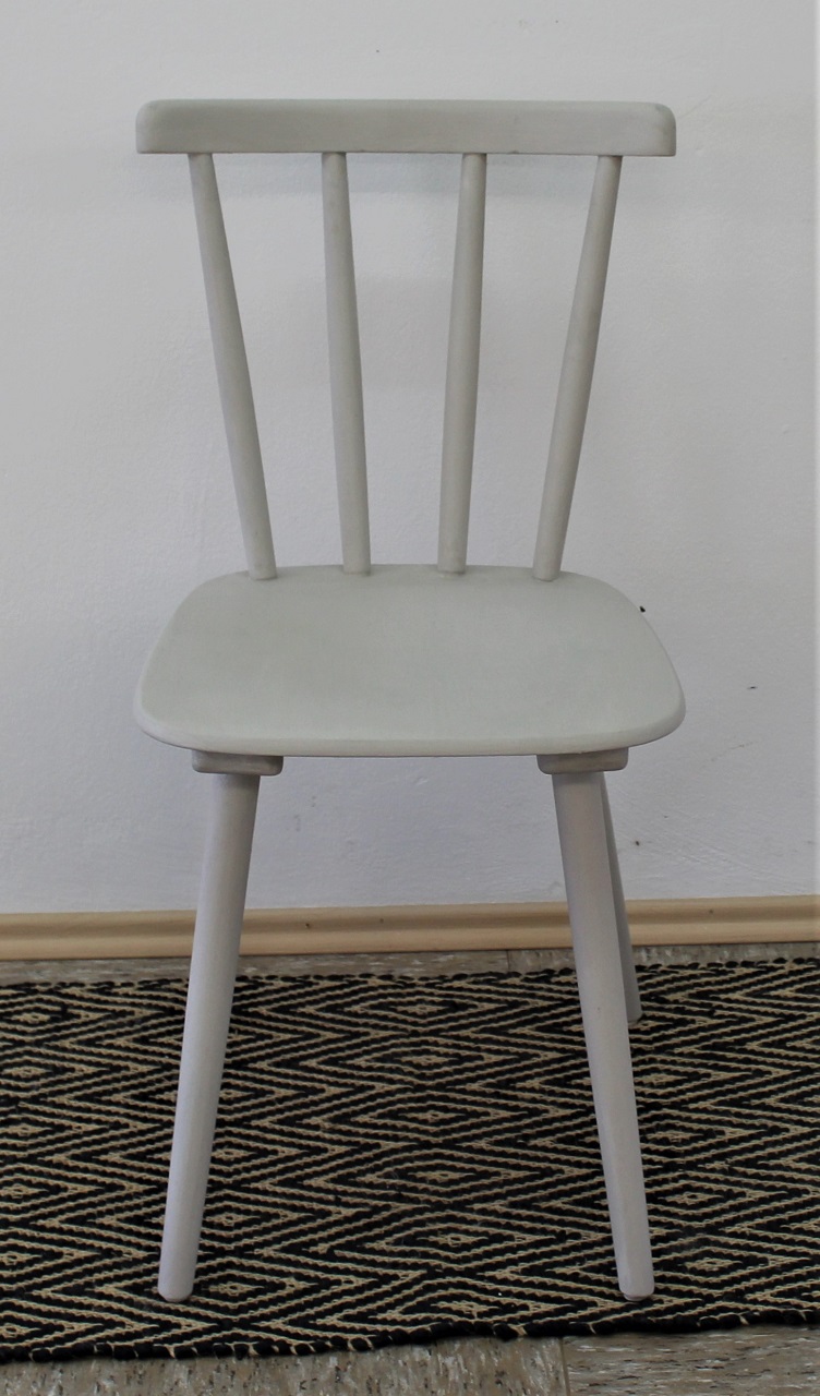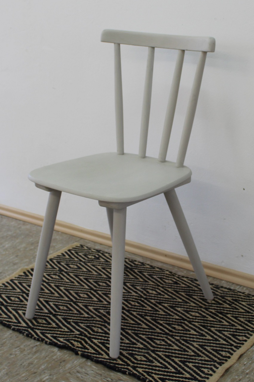 Schöner, älterer Wirtshausstuhl. Gestaltet haben wir ihn mit ökologischer Kreidefarbe (Amazona Taubengrau, = sehr heller Grauton). Als Finish haben wir Bienenwachs verwendet.