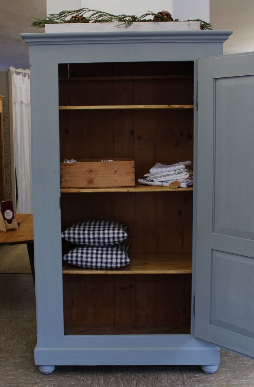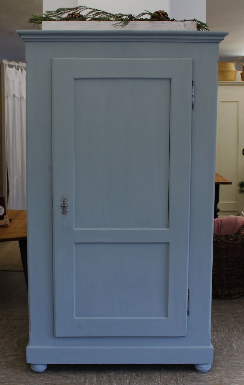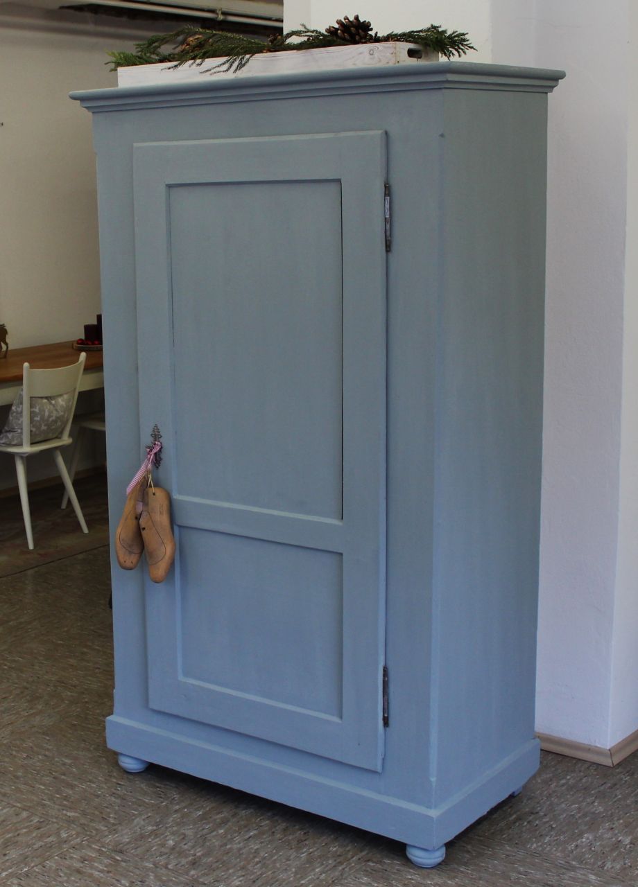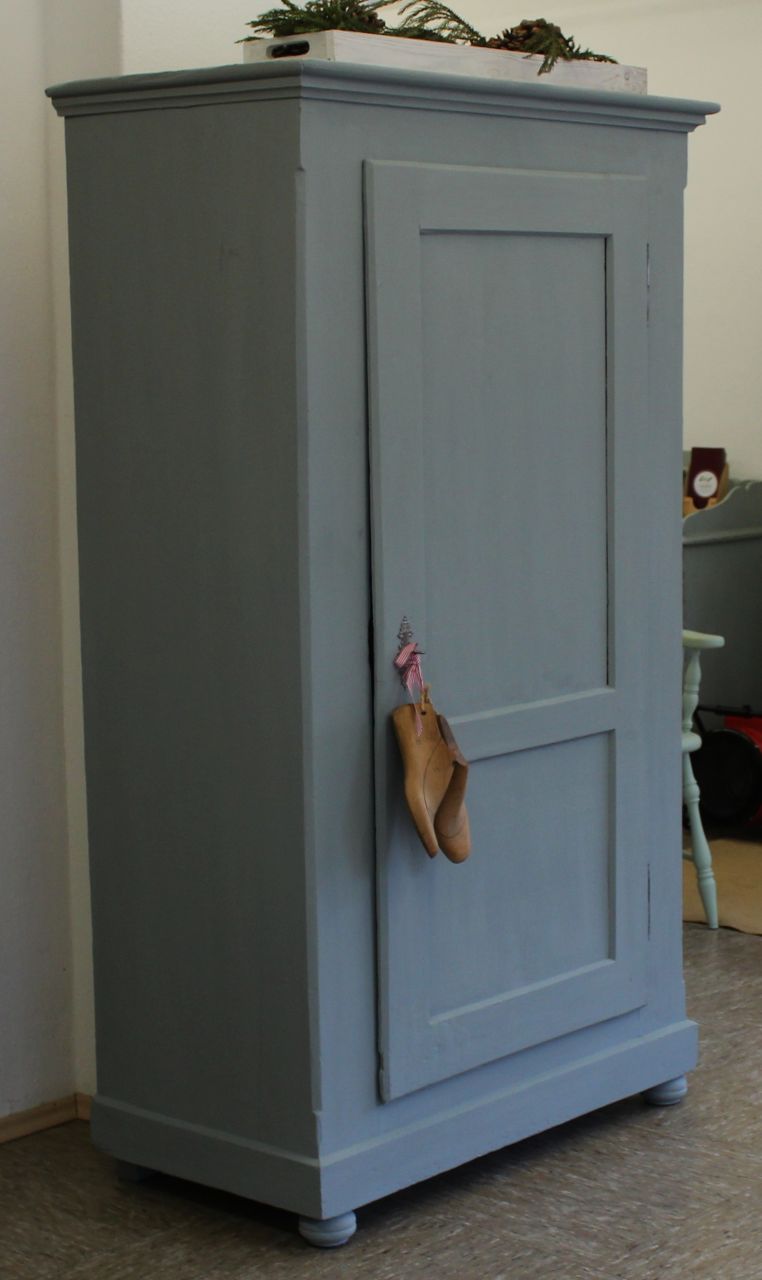 Schöner, antiker Kleiderschrank mit Fachbrettern. Gestaltet haben wir ihn mit ökologischer Kreidefarbe (Amazona, selbst gemischtes Vert de Bleu). Als Finish haben wir ökologisches Amazona Wachs-Finish verwendet. Innen ist er frisch geschliffen und neu gewachst (Bienen-/Carnaubawachs). Die großen Fachbretter und das Schloß sind neu. Verkauf ohne Deko.