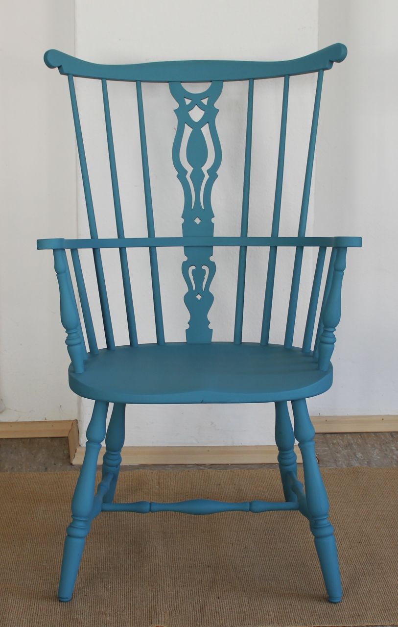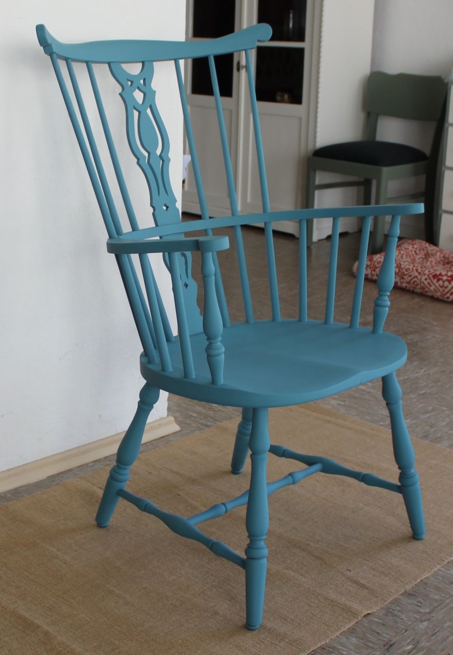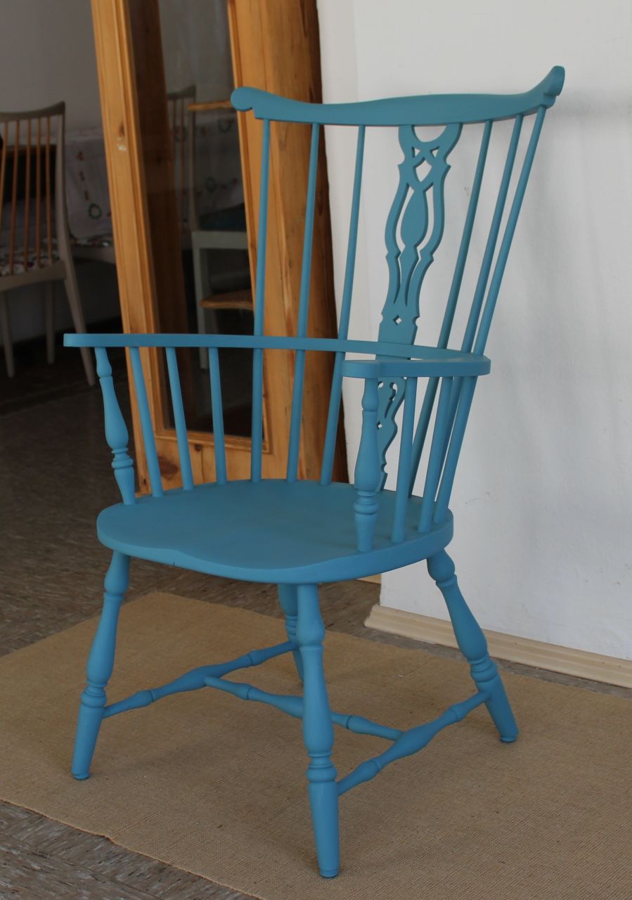 Schöner, antiker Windsorstuhl, kein Esszimmerstuhl, da die Sitzhöhe 4 cm niedriger ist, aber prima zum Relaxen als Einzelstuhl. Gestaltet haben wir ihn mit Kreidelack (Painting the Past, Antik Blau).