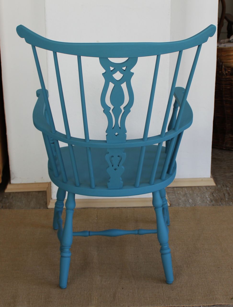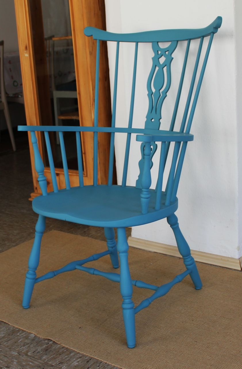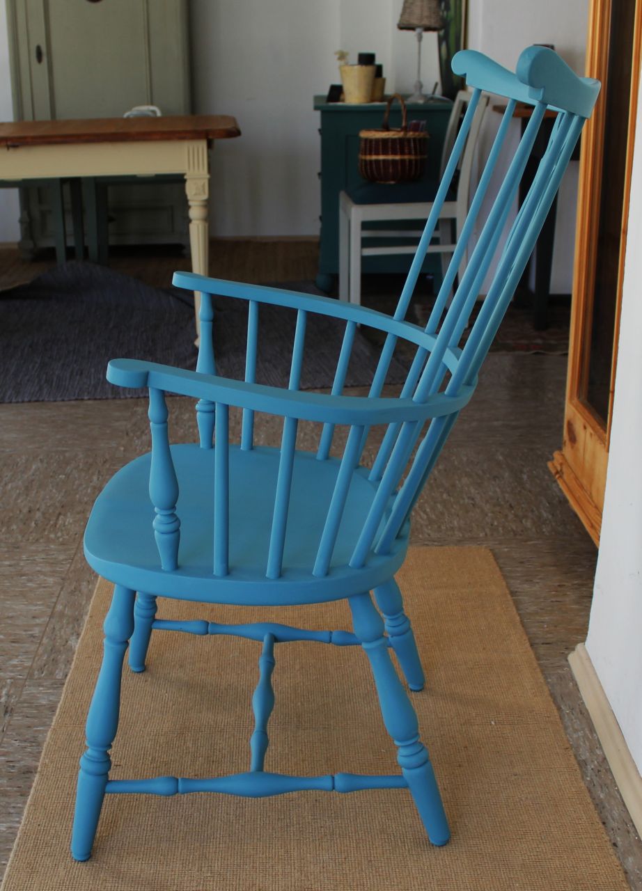 Schöner, antiker Windsorstuhl, kein Esszimmerstuhl, da die Sitzhöhe 4 cm niedriger ist, aber prima zum Relaxen als Einzelstuhl. Gestaltet haben wir ihn mit Kreidelack (Painting the Past, Antik Blau).