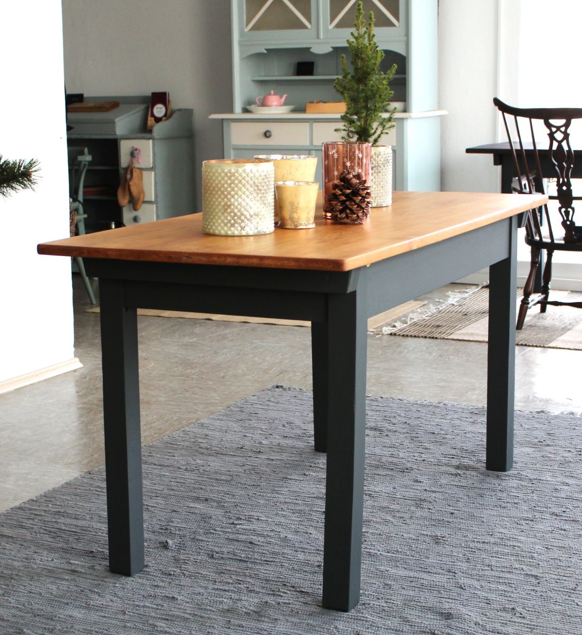Schöner, stabiler Vollholz-Tisch (Buche), vermutlich aus den 60er, 70er Jahren. Das Gestell haben wir mit wasserbasiertem Kreidelack gestaltet (Painting the Past, Urban Black = Schwarz mit einem Grünstich, Nachtgrün). Die Platte ist frisch geschliffen und neu mit lebensmittelechtem Osmo Hartwachs-Öl eingelassen. Verkauf ohne Deko.