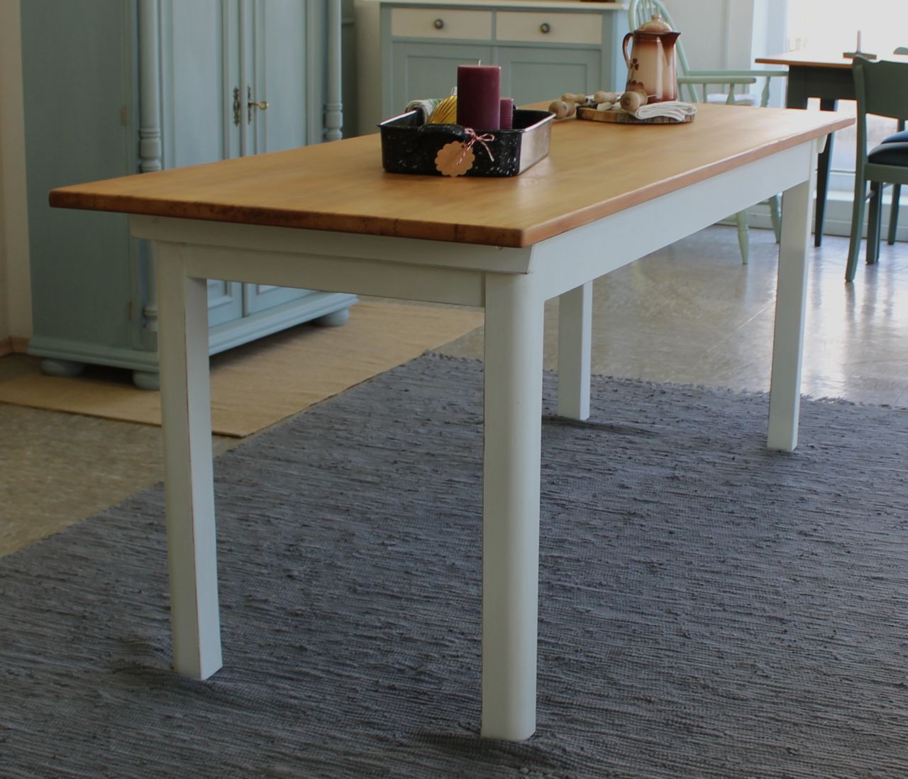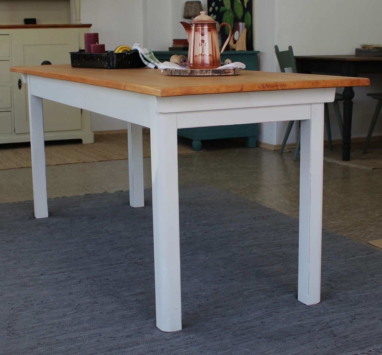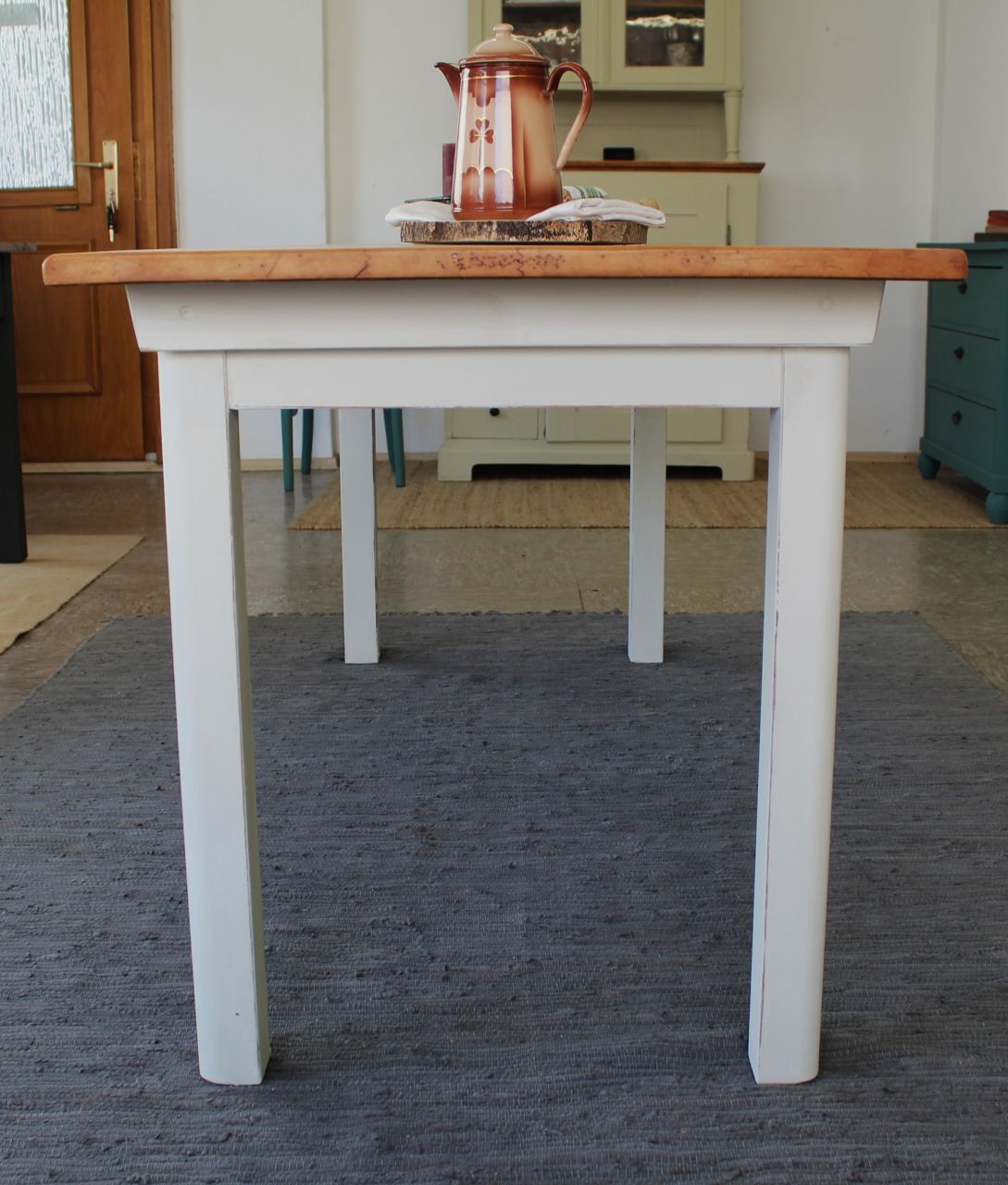 Schöner, stabiler Vollholz-Tisch (Buche), vermutlich aus den 60er, 70er Jahren. Das Gestell haben wir mit ökologischer Kreidefarbe gestaltet (Amazona Off-White). Vor dem Versiegeln mit Bienenwachs haben wir die Kanten angeschliffen. Die Platte ist frisch geschliffen und neu mit lebensmittelechtem Osmo Hartwachs-Öl eingelassen. Die auf dem letzten Foto abgebildeten Stühle können separat erworben werden. Verkauf ohne Deko.