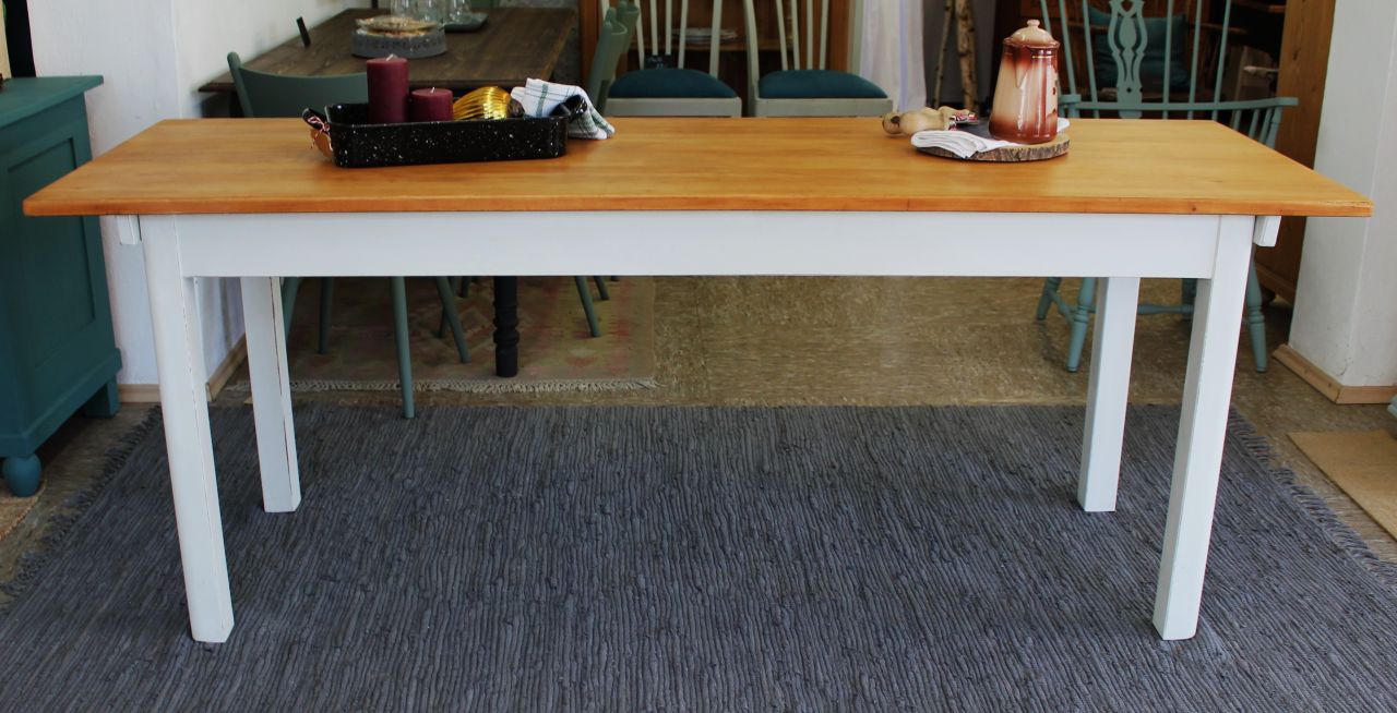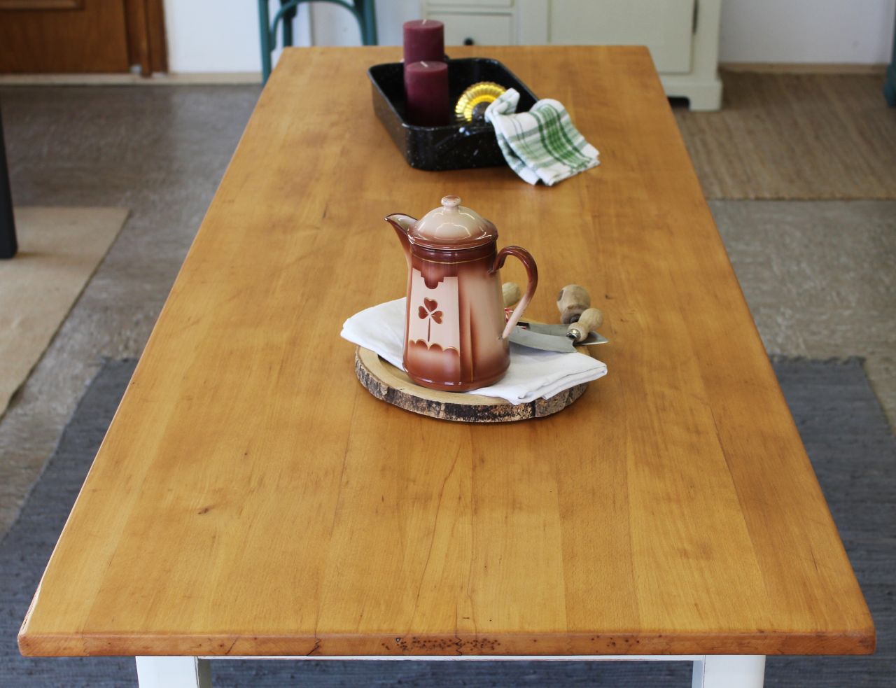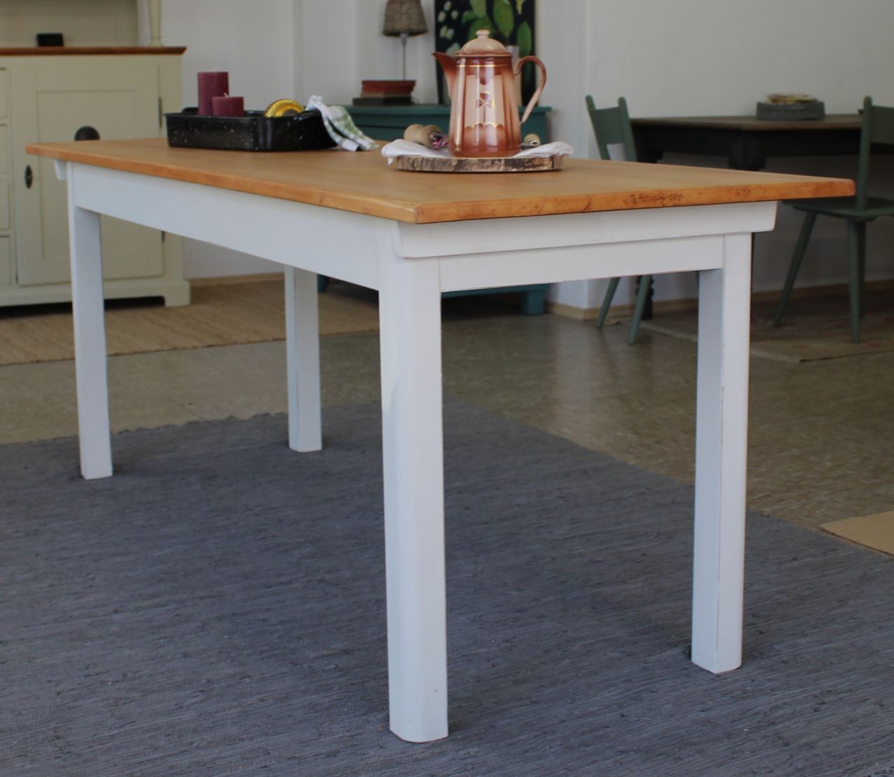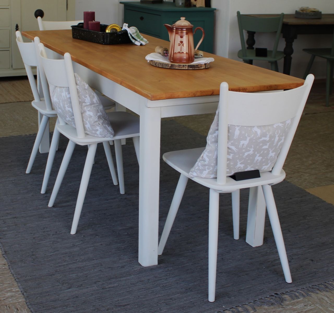 Schöner, stabiler Vollholz-Tisch (Buche), vermutlich aus den 60er, 70er Jahren. Das Gestell haben wir mit ökologischer Kreidefarbe gestaltet (Amazona Off-White). Vor dem Versiegeln mit Bienenwachs haben wir die Kanten angeschliffen. Die Platte ist frisch geschliffen und neu mit lebensmittelechtem Osmo Hartwachs-Öl eingelassen. Die auf dem letzten Foto abgebildeten Stühle können separat erworben werden. Verkauf ohne Deko.